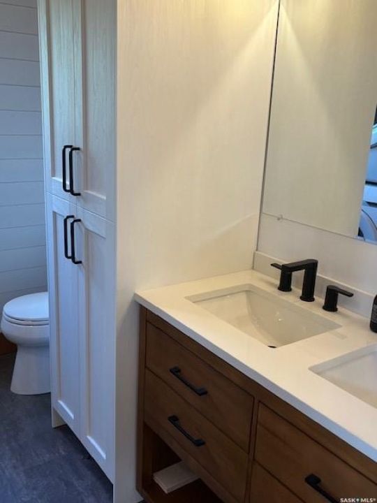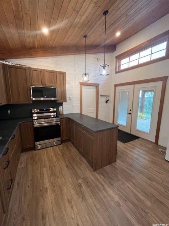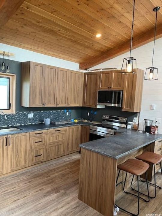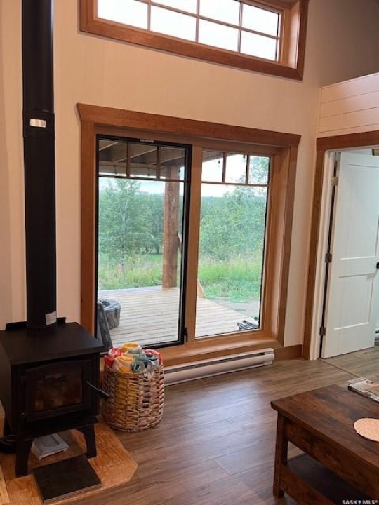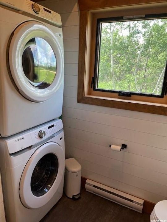 You don't have to buy an old "fixer upper" to be able to afford a home at the lake! Brand new low footprint option that's efficient and affordable! Smaller bedroom, combined bathroom and utility leaves spacious kitchen and living room. South facing deck just above the trees backing Wakaw Lake Golf Course.Included is a brand new double garage with full cement floor and remote openers. Just off the lake private and quiet!