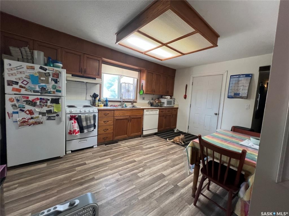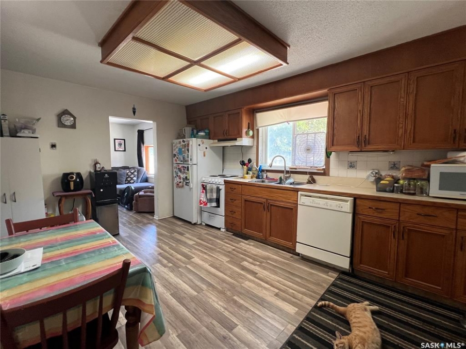 LOOKING FOR A PROPERTY TO MAKE YOUR OWN? How about 405 Sussex Avenue in Esterhazy? This property is nestled on a generous 71' x 113' lot—totaling over 7,600 sq. ft.—this charming property offers great potential for first-time buyers or anyone seeking a manageable fixer-upper project. Built in 1945, the home's 742 sq. ft. layout provides a cozy space you can truly make your own.The property features a 24' x 26' two-car garage, split for convenience: one side serves as a workshop, while the other is dedicated to parking. A double asphalt driveway easily accommodates up to four vehicles, in addition to the two garage spots.Inside, the main floor laundry is set just off the kitchen/dining area. The kitchen is impressively sized, offering abundant cabinet space, a built-in dishwasher, stove, hood fan, and fridge. The home also includes a spacious four-piece bathroom, two bedrooms, and a comfortable living room that faces the street.Outdoors, mature trees surround the property, creating natural privacy. A rear deck offers a quiet retreat, perfect for relaxing or entertaining. The location is another highlight—just steps from St. Anthony's Hospital and close to other key amenities.With its solid bones, ample parking, and desirable lot size, 405 Sussex Avenue is a great opportunity to start your homeownership journey. Contact your agent today to book your private viewing.