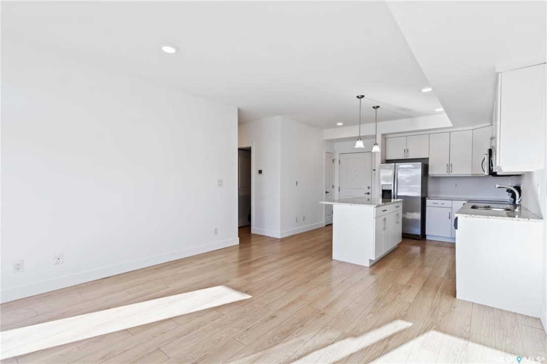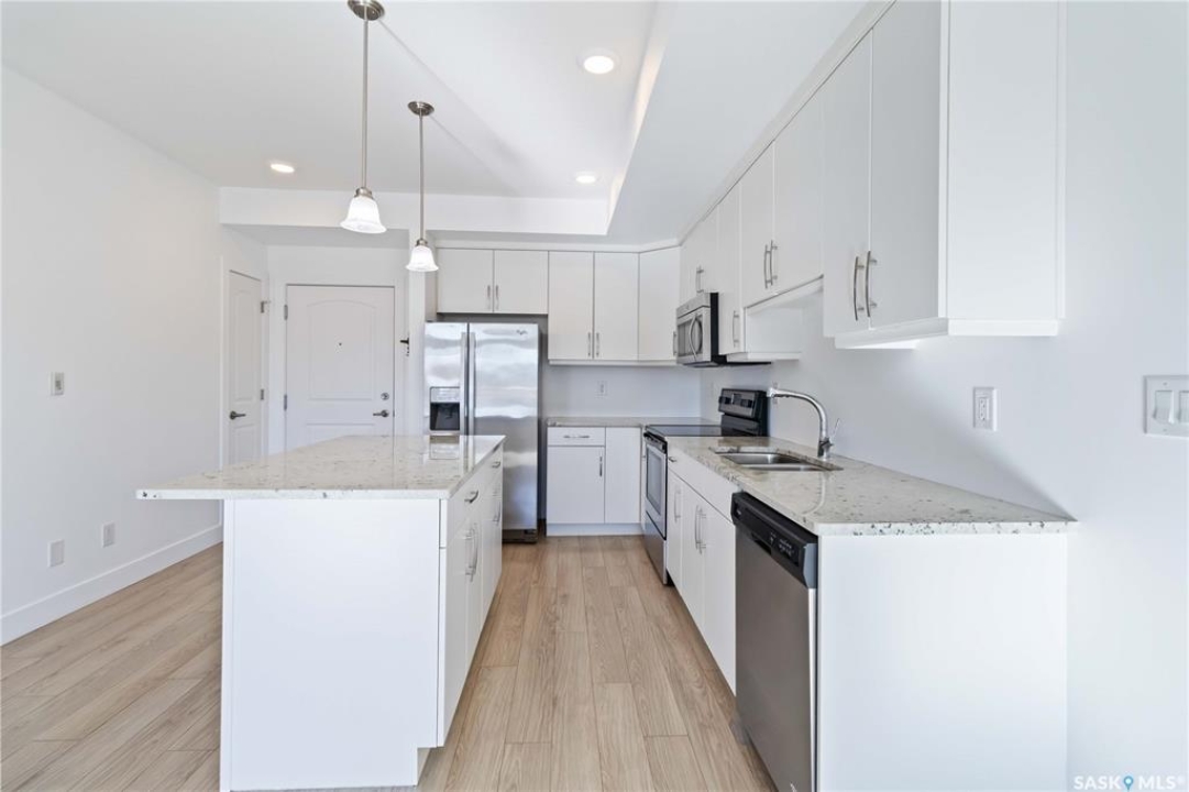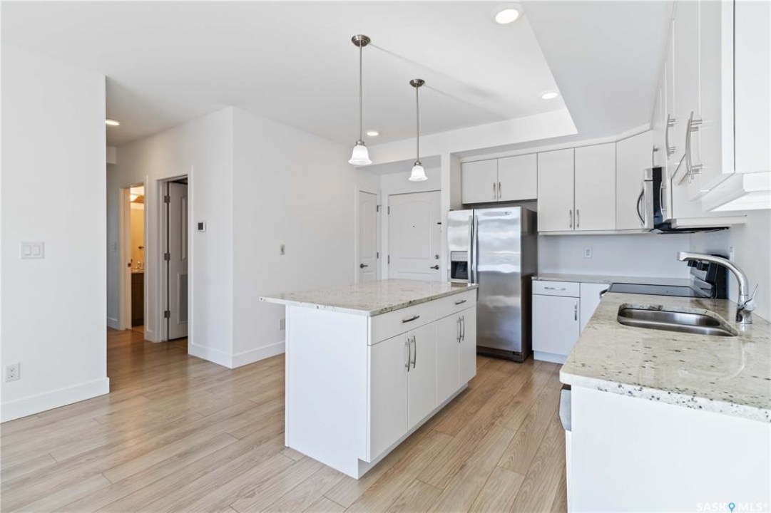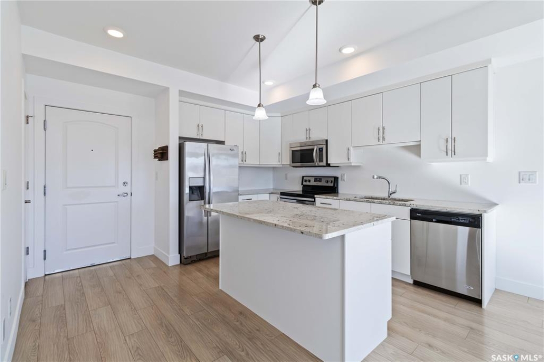 Welcome to modern and convenient living at 770 Childers Crescent in the vibrant community of Kensington! This 936 sq/ft apartment-style condo is designed for comfort and ease. As you step inside, you'll be greeted by an open and bright living area featuring large windows and durable vinyl plank flooring. The impressive kitchen is the heart of the home, offering sleek quartz countertops, a full set of stainless steel appliances, ample storage, and a large island with an eat-up bar that's perfect for entertaining. Step out onto the generous-sized balcony to enjoy your private outdoor space. This unit is equipped with essential comforts, including in-suite laundry, central air conditioning, and efficient forced-air heating. Forget scraping windows in the winter—this property includes a parking stall in the secure, heated underground parkade with convenient elevator access directly to your floor. Located just a short walk from all the amenities Kensington has to offer, including groceries, restaurants, banks, and parks, and with quick access to major city routes, this location is second to none. This condo offers the perfect blend of style, function, and location. Contact your real estate agent to schedule a private viewing today!
