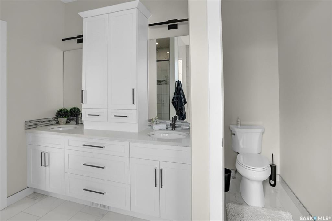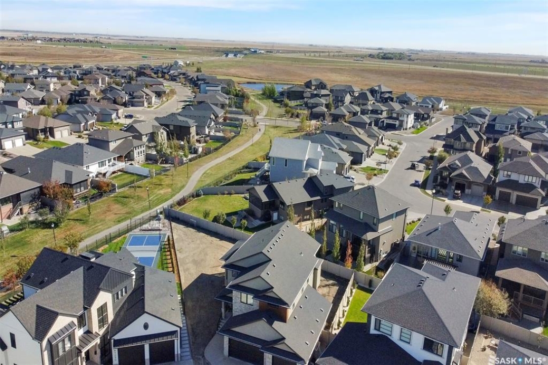 Welcome to 4244 Elderberry Crescent E, Where Luxury Meets Livability. Nestled in Regina's premier neighbourhood, The Creeks, this exceptional Gilroy-built home blends contemporary elegance with practical design. From the moment you turn onto the quiet crescent, you'll feel right at home. Sitting on a massive 11,000+ sq. ft. pie-shaped, park-view lot, this property offers endless potential to create your dream outdoor space. The acrylic stucco and stone-accented exterior paired with a grand entryway set an impressive tone from the moment of arrival. Step inside to a breathtaking two-storey foyer that opens into a spacious family room, complete with a full feature presentation wall. The chef's kitchen is a true showstopper, featuring a large eat-up island, abundant drawer storage, upgraded Chef's style appliances, and a walk-in pantry built for organization and convenience. A stylish 2pc bath, mudroom, and laundry area round out the main floor. The triple attached heated garage offers ample room for parking, projects, entertainment, and storage. Upstairs, unwind in the oversized bonus room overlooking the foyer or get productive in the dedicated office (or optional 4th bedroom). Two generously sized secondary bedrooms each feature their own walk-in closets. The primary suite is a private retreat, showcasing impressive square footage outfitted in plush carpeting, a spa-inspired ensuite with dual sinks, a deep soaker tub, and a custom-tiled shower, plus direct access to a beautifully designed walk-in closet. The newly finished basement adds even more living space, including a sprawling rec room, nook or workout area, a full bathroom, and a fifth bedroom ideal for guests or a growing family. To top it all off, enjoy year-round relaxation in the 4 season heated sunroom, complete with a hot tub, the perfect spot for entertaining or unwinding after a long day. 4244 Elderberry Crescent E is more than a home, it's a statement of quality, comfort, and modern luxury.
