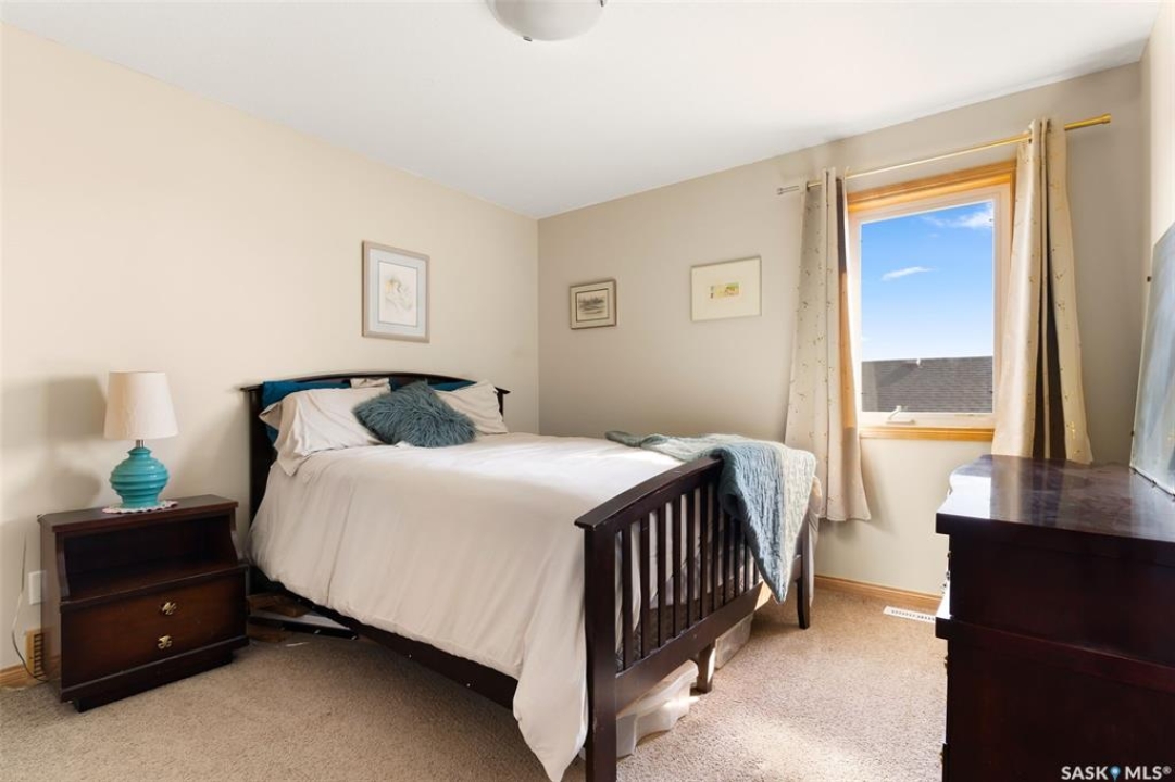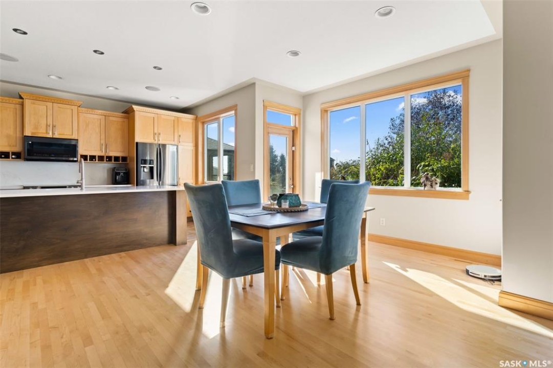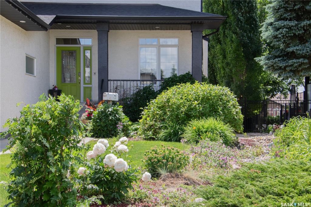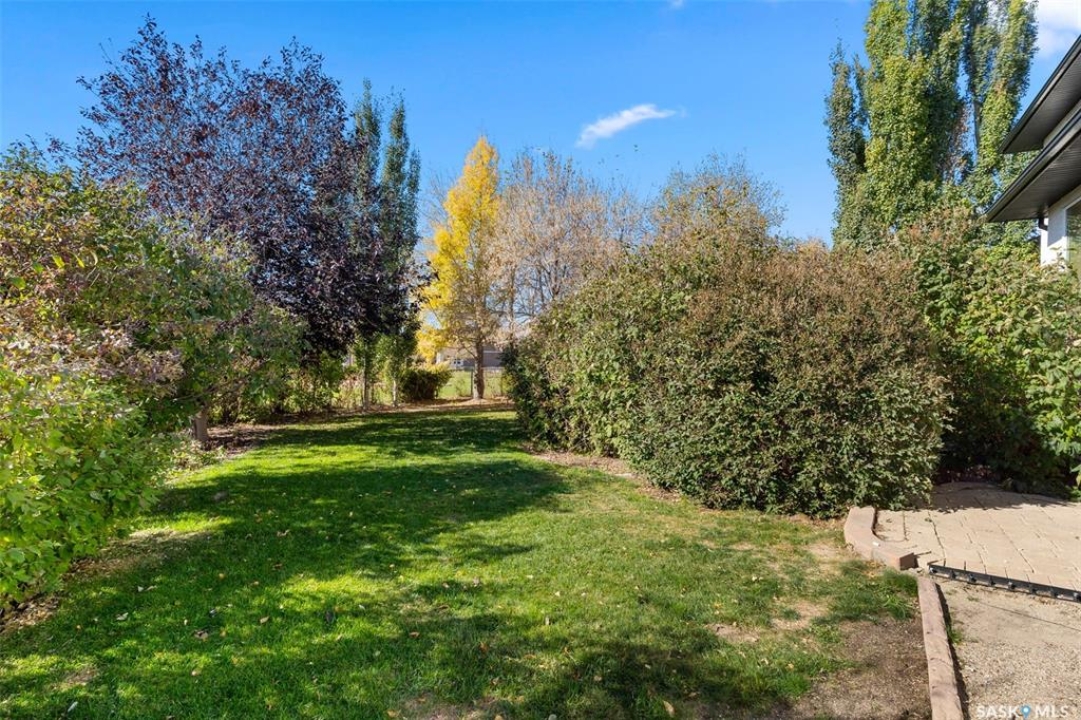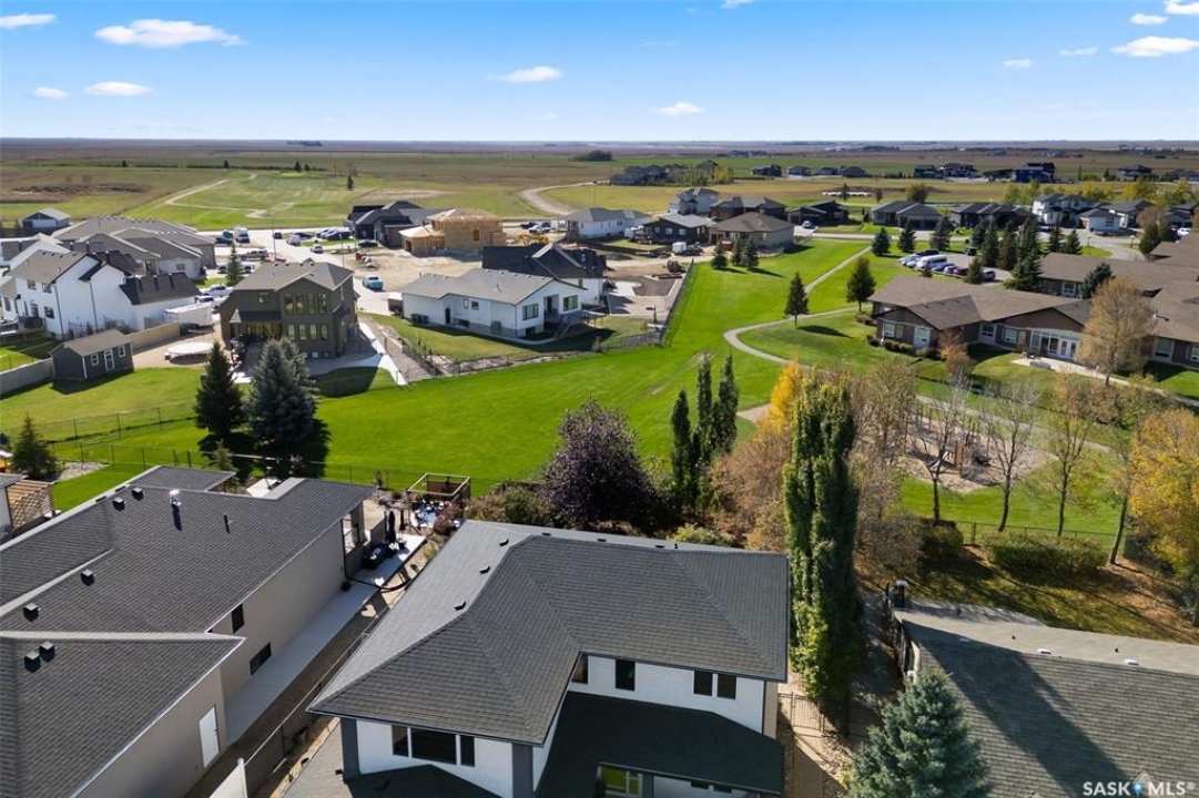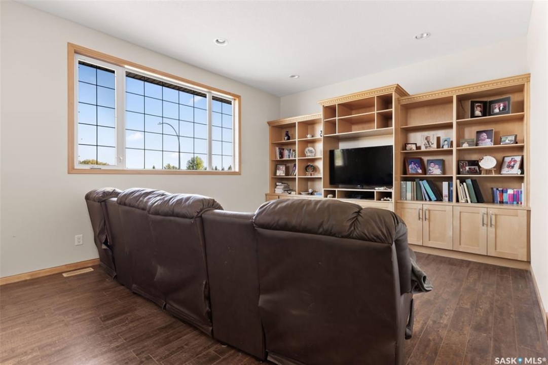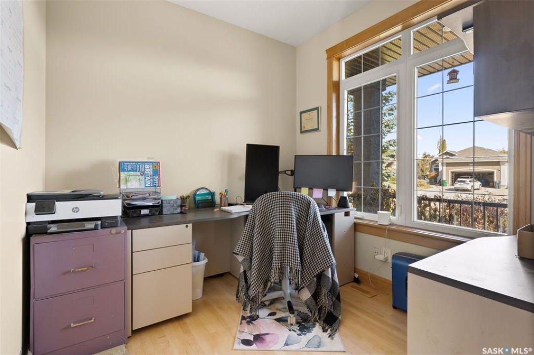 Gorgeous 2 story home in Emerald Park in prime location. Custom built home by Ripplinger Homes is nearly 2200 sq/ft and backs green space and southern exposure. Loads of natural light throughout. Welcoming entrance with ceramic tiled flooring transitions into maple hardwood floors. Main floor office is the perfect space for those who work from home. Spacious living room with natural gas fireplace with tiled accent and maple trim. There's an open view to the backyard thanks to a large picture window. Nice transition to the formal dining and kitchen area, upgraded kitchen island with quartz countertops ('24), stainless steel appliances and two piece bathroom. Main floor hardwood flooring was refinished in 2025. Direct entry to the 26 x 28 garage. Second level features 3 large bedrooms PLUS a bonus room that's the perfect media space. Walk-in closet in the primary bedroom and large ensuite. Basement is fully finished with additional bedroom and rec-room area and 3 piece bathroom. (current vanity will be changed out). Gorgeous and private backyard with mature trees, storage shed and hot tub included. Other recent upgrades include: shingles ('2018), new paint (2024), furnace ('23), c/air ('24). Move in ready family home is close to schools, shopping and Regina's east end amenities.