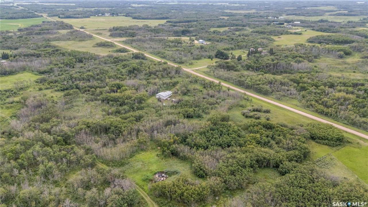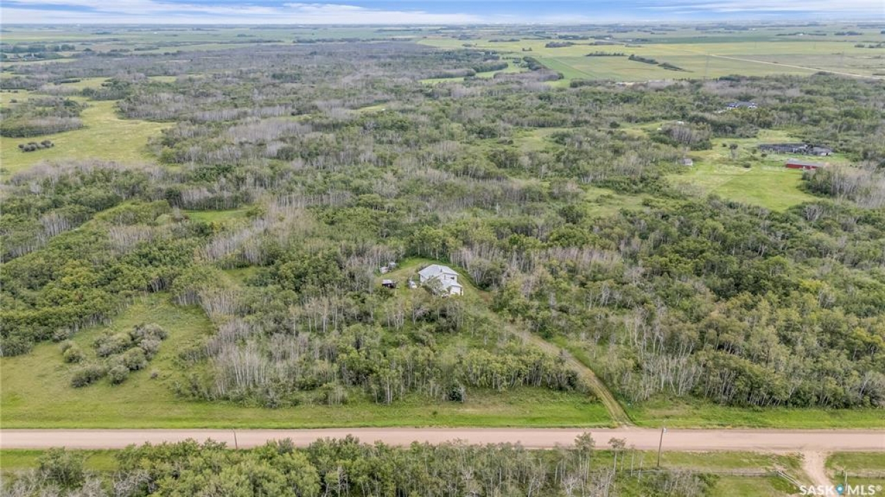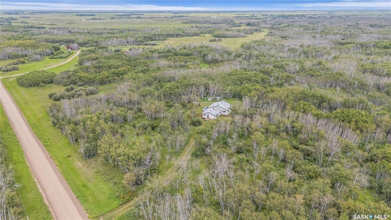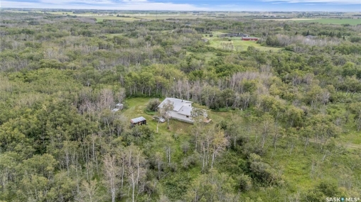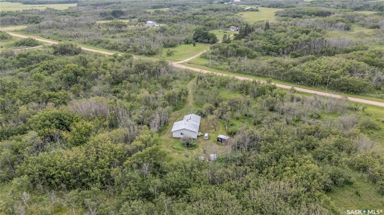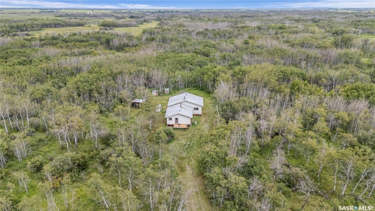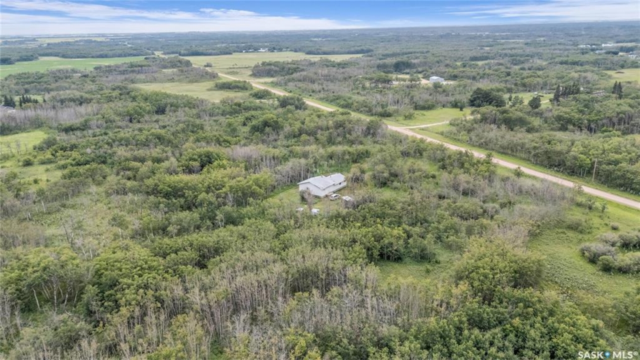 A rare opportunity to own10 acres just 15 minutes from Saskatoon, make this acreage your own personal sanctuary. Heavily covered by poplars, it's not uncommon to see deer, moose, fox, and a vast array of bird species. This 720 square foot bungalow is 1984 built, with an attached heated 26 X 36 shop for wood work, art studio or hobby space. Primary heat is two Osburn wood stoves and electric baseboards, natural gas to the property line & well water source. Features handmade oak & ash cabinets, custom stained glass door, 4 piece bathroom, front & back deck, and more!
