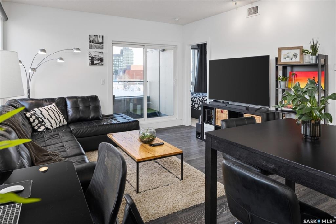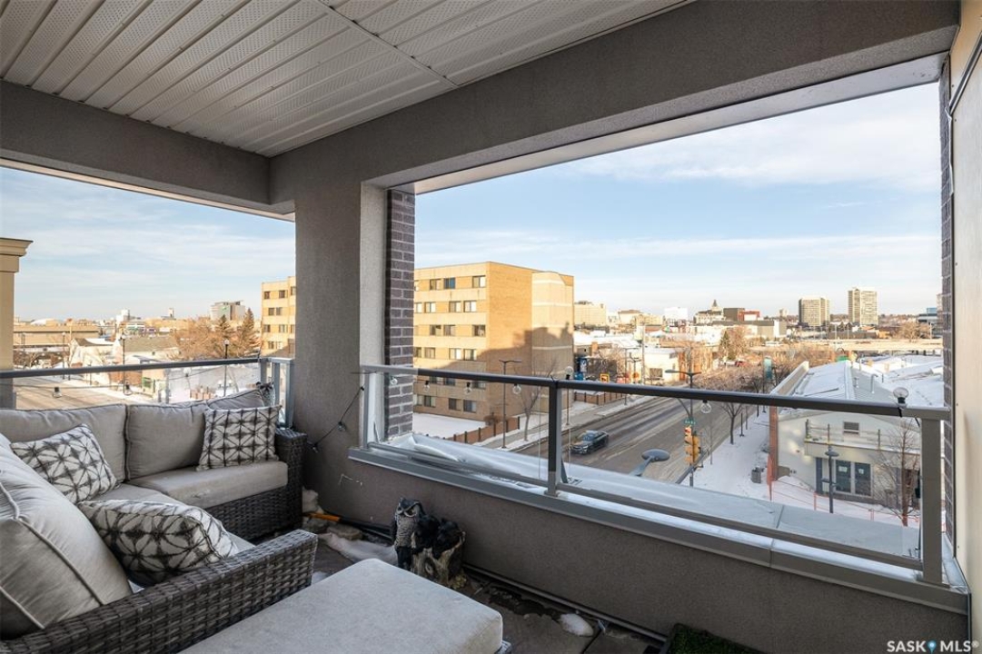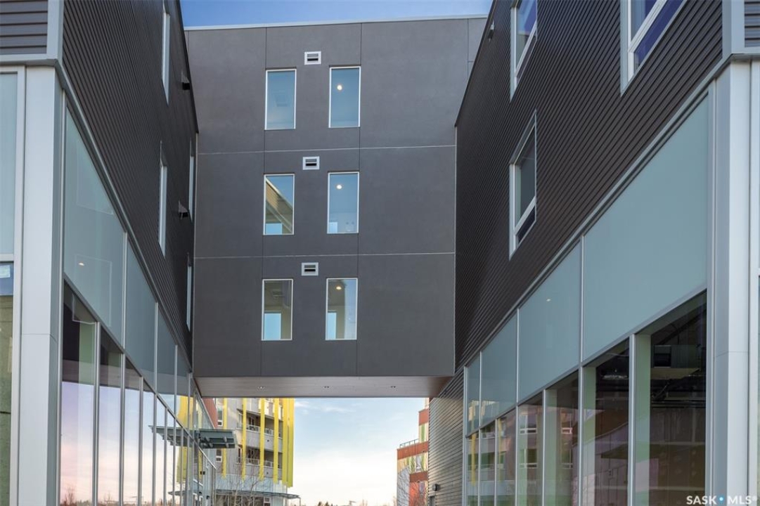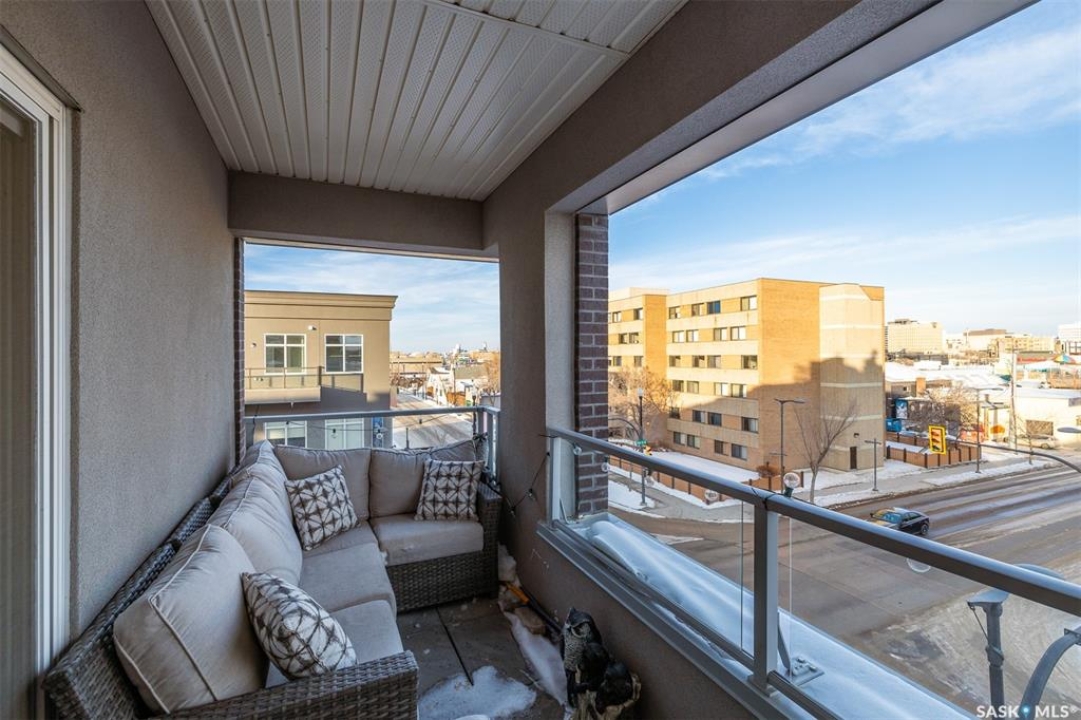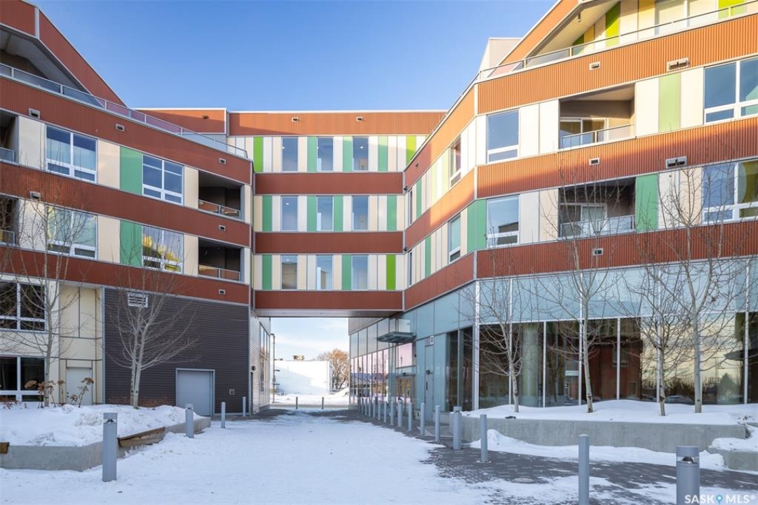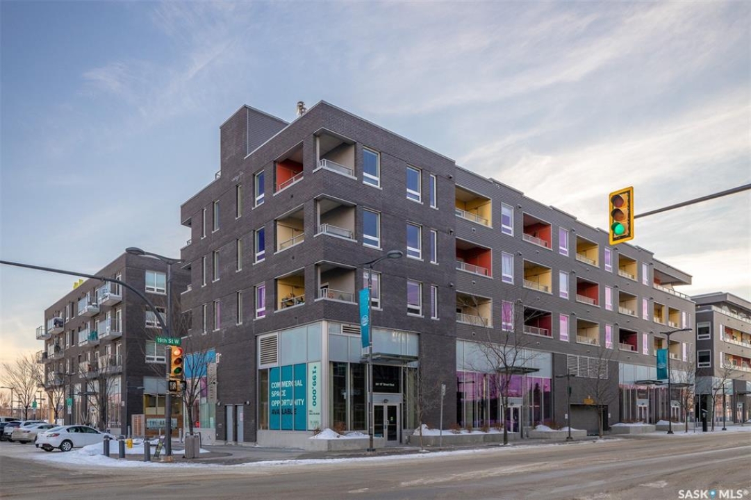 Vibrant Riversdale is calling you home!!! This corner unit with a stunning Downtown View from its LARGE BALCONY is just STEPS from the Riverbank, 20TH St, AND Downtown! This unit features a spacious bedroom, 1 bathroom, and a den/office. The kitchen is beautifully finished with high-quality cabinetry, quartz countertops, a stainless steel backsplash, and all appliances, including in-suite laundry. Riversdale is an exciting and vibrant neighbourhood, and this development is in the heart of it all. Homequarter, Guide Salon, and Local Barre are right in the complex, to name a few, with the action of 20th street at your fingertips. The unit also features heated underground parking, underground storage, and separate bicycle storage. Call your favourite realtor for a private viewing today!! Quick Possession Available!!