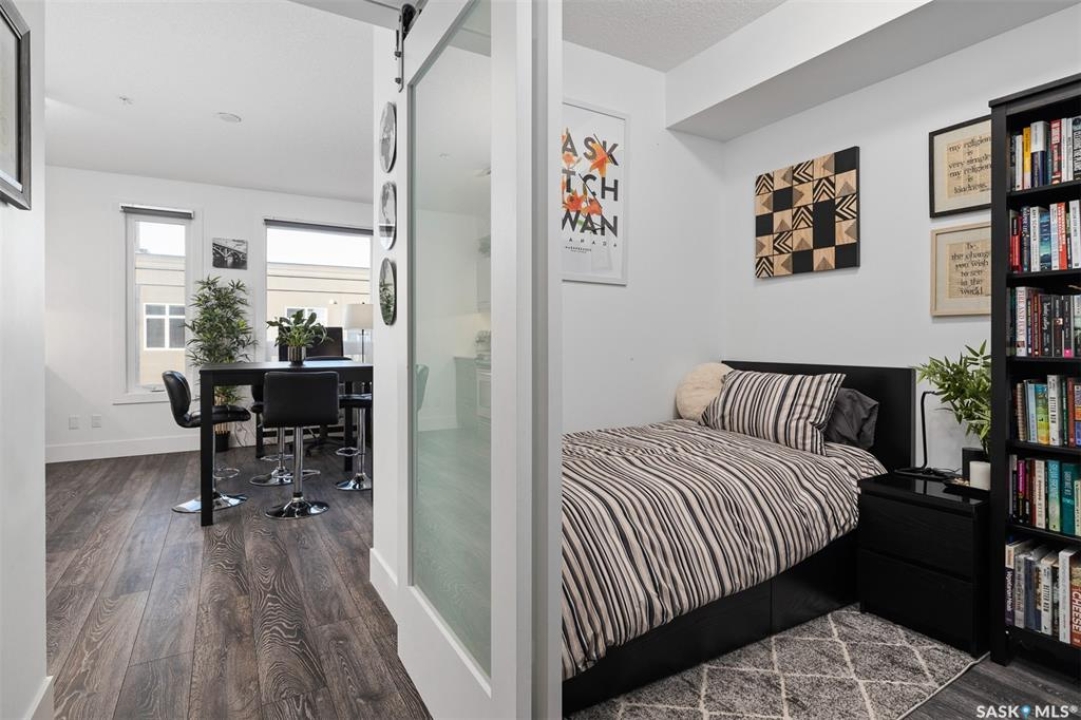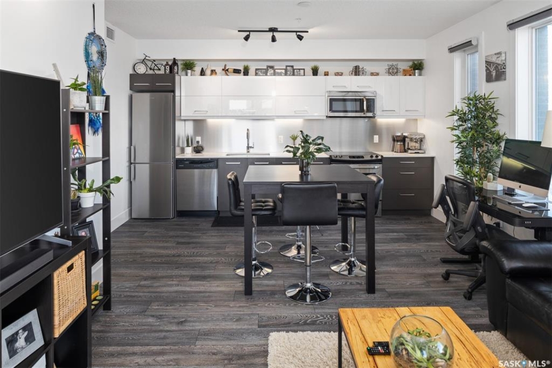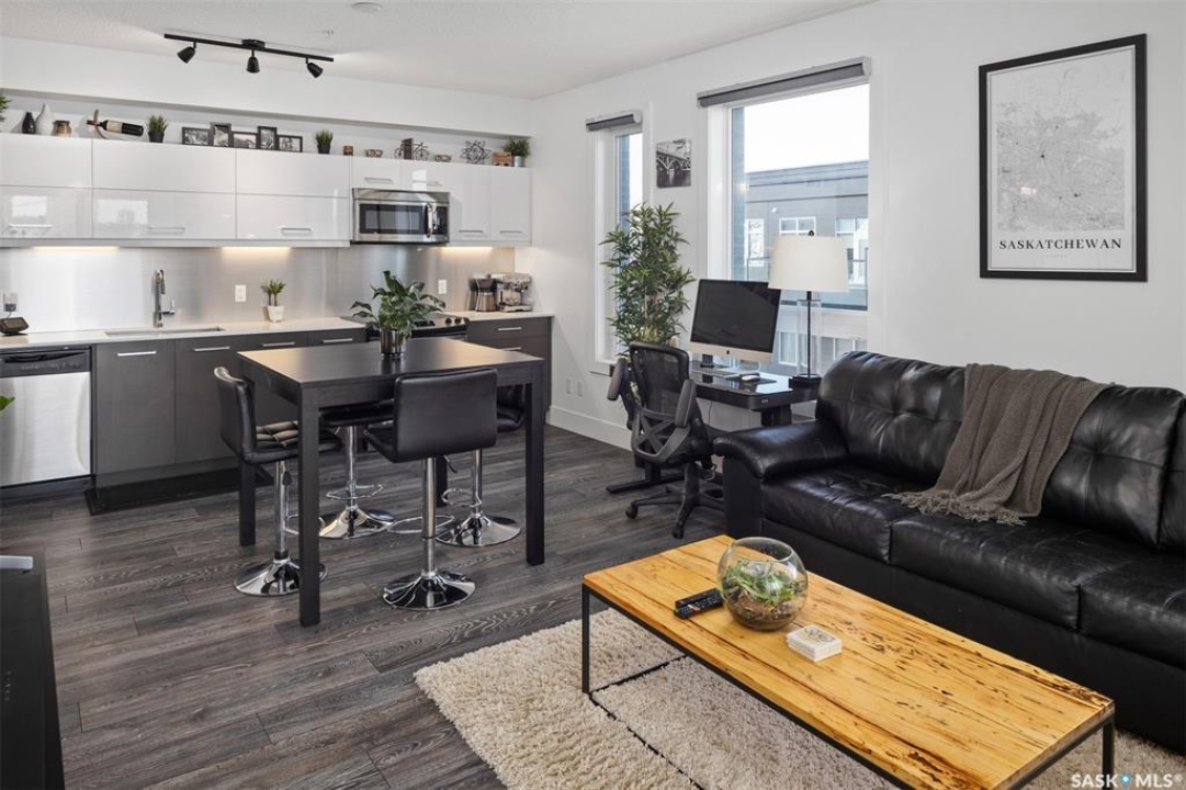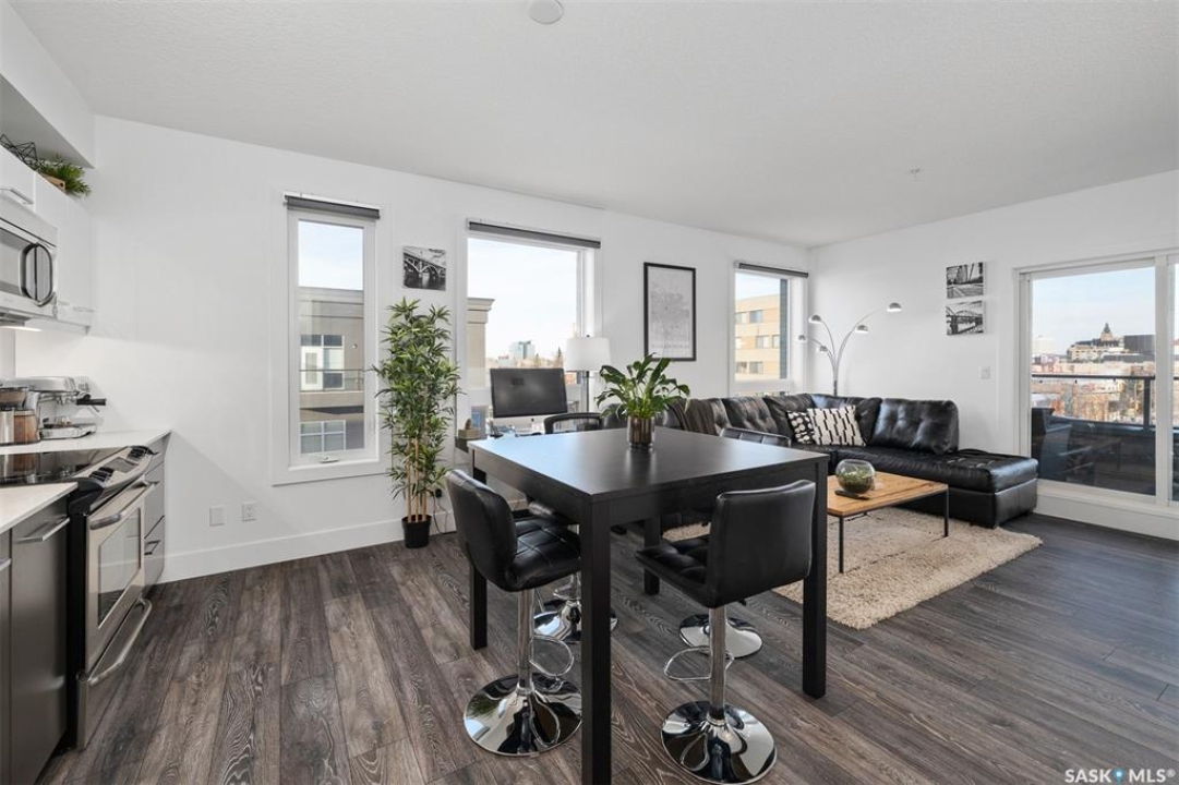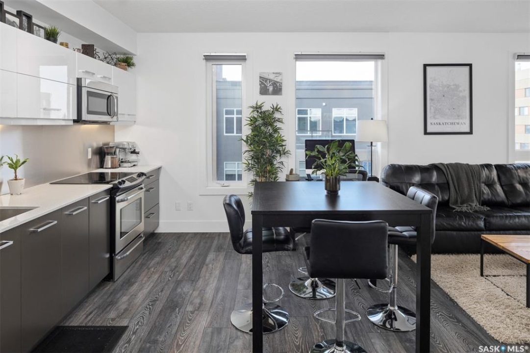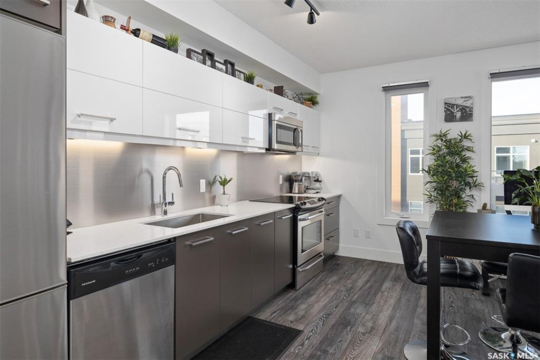 Vibrant Riversdale is calling you home!!! This corner unit with a stunning Downtown View from its LARGE BALCONY is just STEPS from the Riverbank, 20TH St, AND Downtown! This unit features a spacious bedroom, 1 bathroom, and a den/office. The kitchen is beautifully finished with high-quality cabinetry, quartz countertops, a stainless steel backsplash, and all appliances, including in-suite laundry. Riversdale is an exciting and vibrant neighbourhood, and this development is in the heart of it all. Homequarter, Guide Salon, and Local Barre are right in the complex, to name a few, with the action of 20th street at your fingertips. The unit also features heated underground parking, underground storage, and separate bicycle storage. Call your favourite realtor for a private viewing today!! Quick Possession Available!!