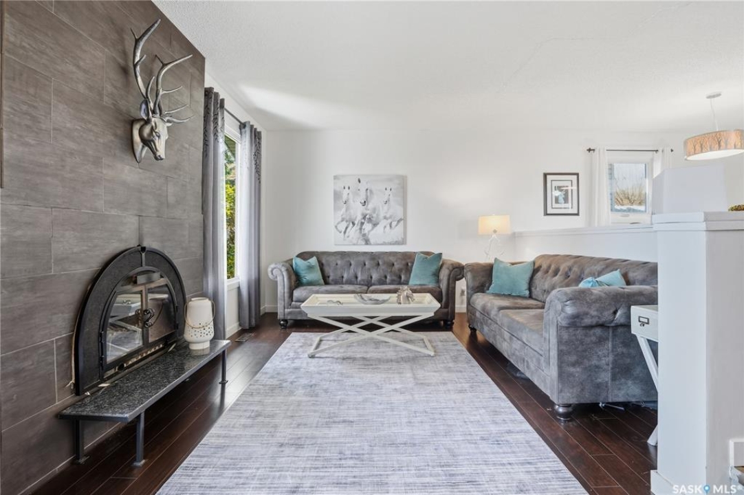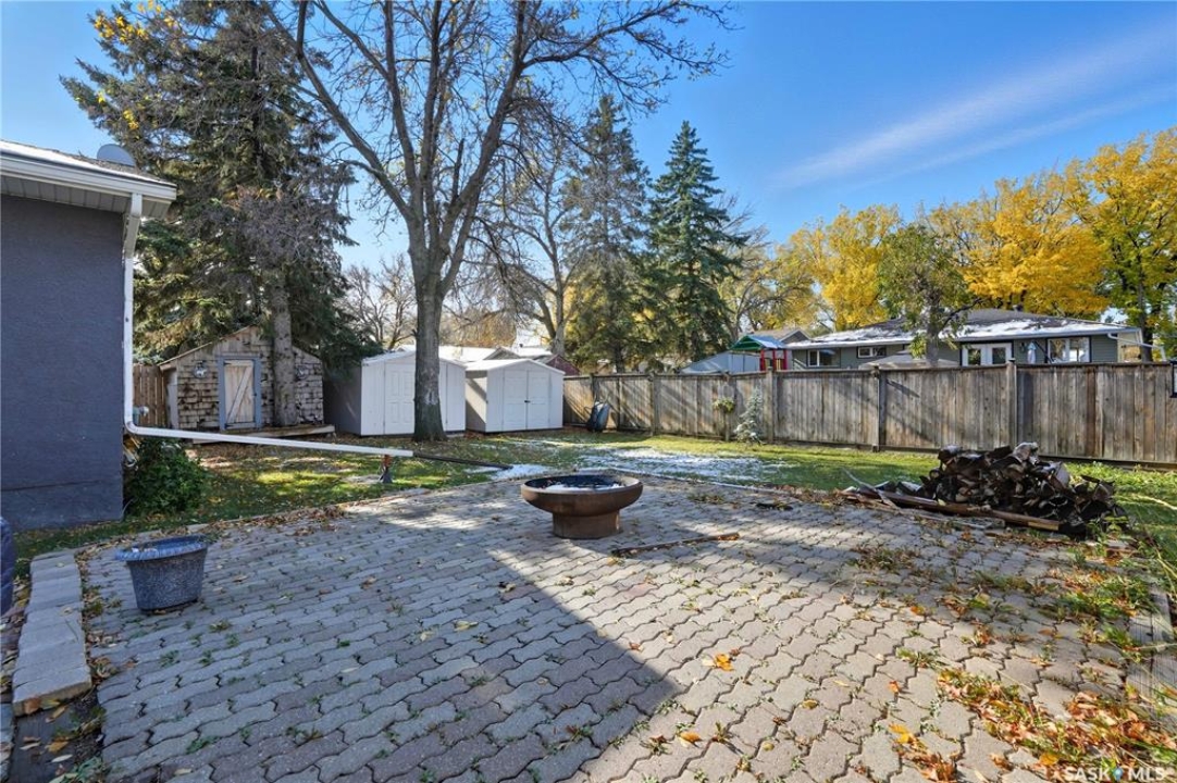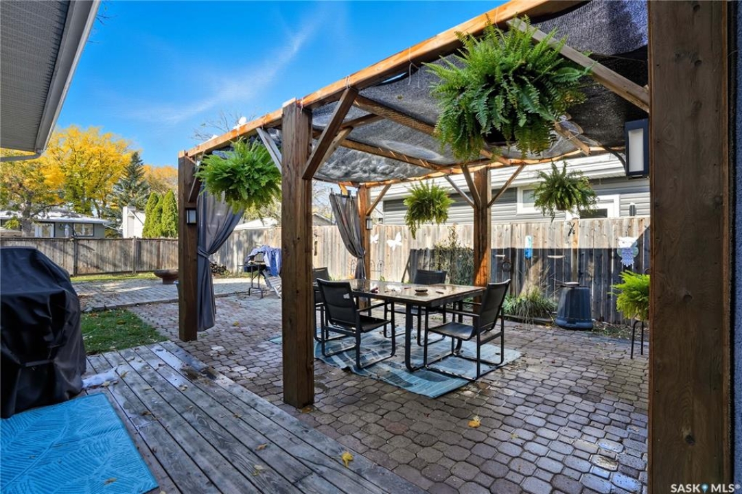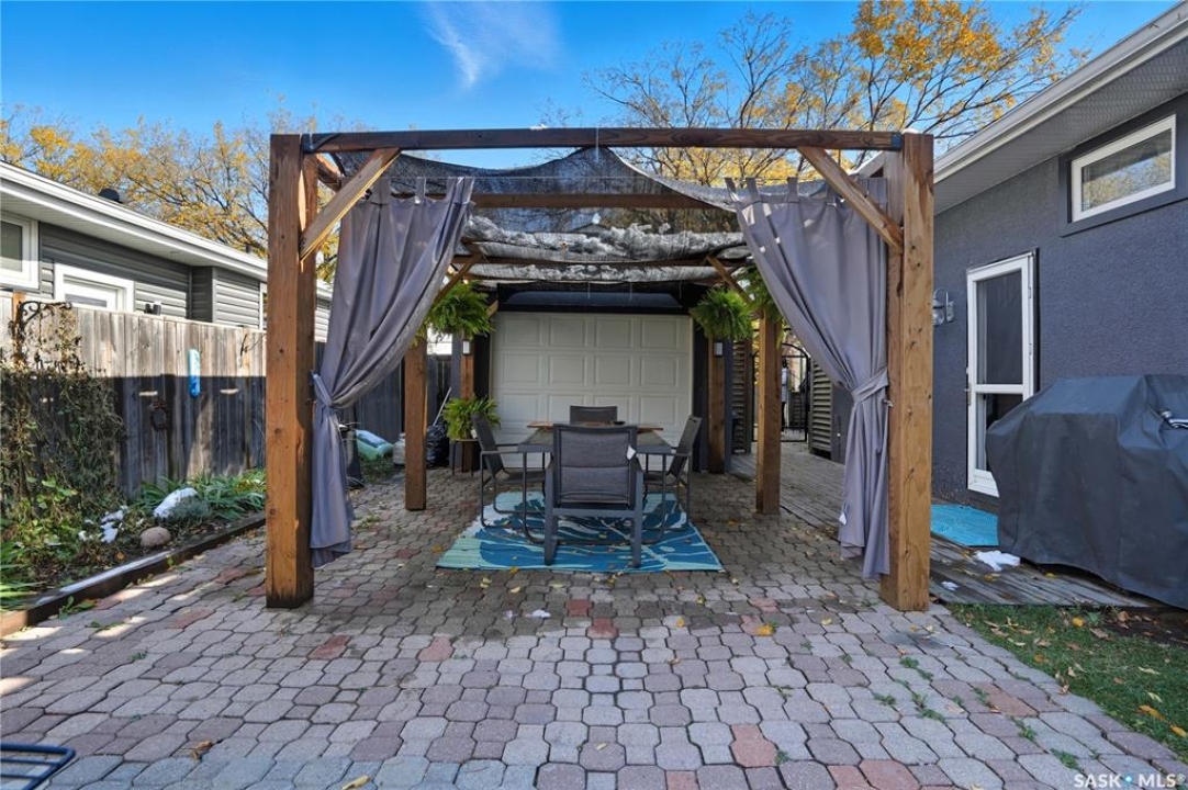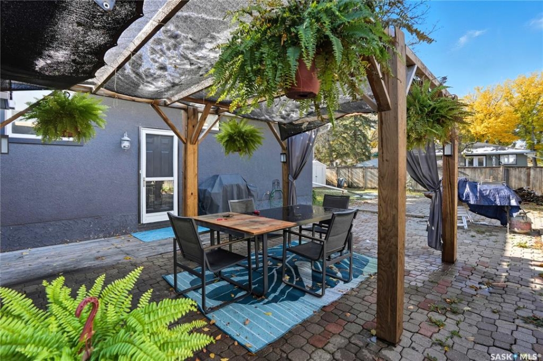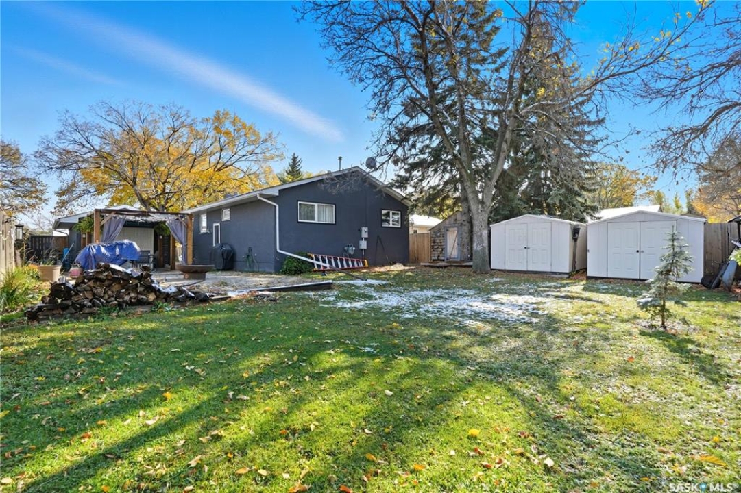 Welcome to this beautifully updated home tucked away on a quiet bay in one of the city's most loved neighbourhoods! The large, private yard is perfect for entertaining, complete with a tandem door off the garage that opens right into your backyard oasis - a patio covered by a pergola with all the furniture included + 3 sheds for storage and a large grassy area perfect for kids and pets. The finished garage provides additional storage + a place for comfortable off-street parking. Inside, you'll find an inviting open-concept layout with a cool, modern-luxurious vibe. A beautifully updated kitchen features glass tile back splash, stainless steel appliances + a complimentary dedicated dining area. The cozy, sunken living room is accented by a tiled fireplace alongside large windows providing natural light. The rest of the main floor offers a primary room with a 2pc ensuite, plus two good-sized bedrooms, ample storage throughout, and an updated 4pc bathroom. Some recent updates include carpet in the bedrooms, fresh paint, updated baseboards, and modern lighting. The fully developed basement is ideal for older kids or guests, featuring a spacious rec room with a wet bar, an additional bedroom, and a stylish 3-piece bath with tiled shower. Major updates to this home include shingles (2019) central A/C, washer & dryer, and an exterior refresh with new paint (all 2025). Located close to great schools, parks, and north-end amenities, this home perfectly blends comfort, function, and location.