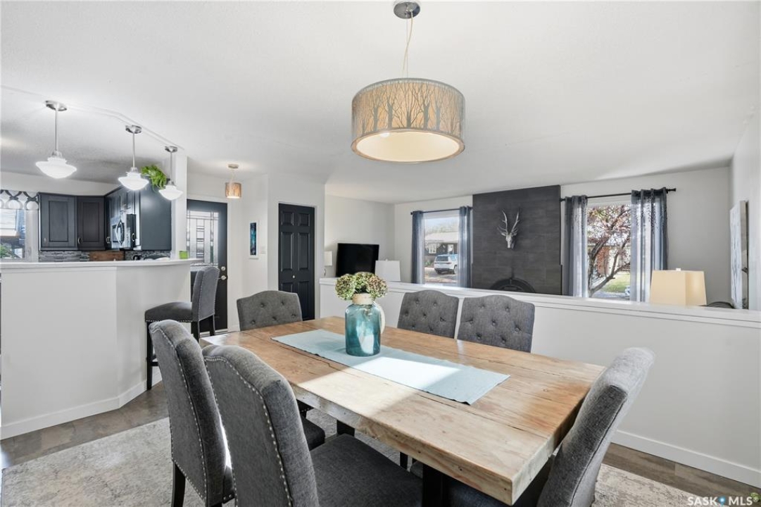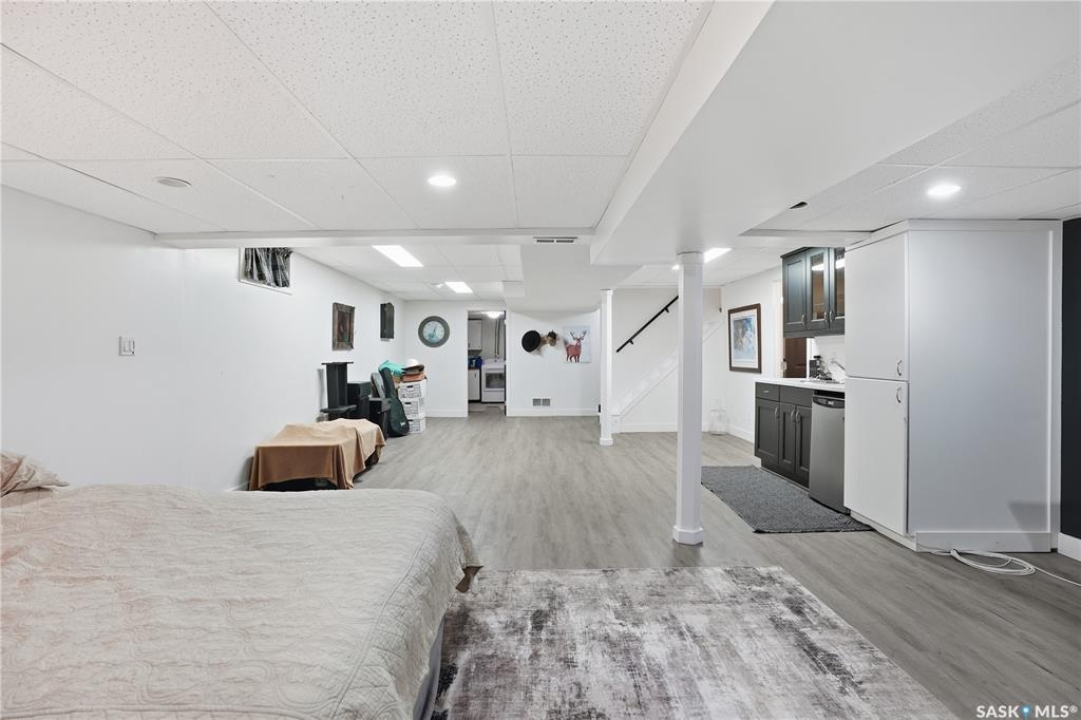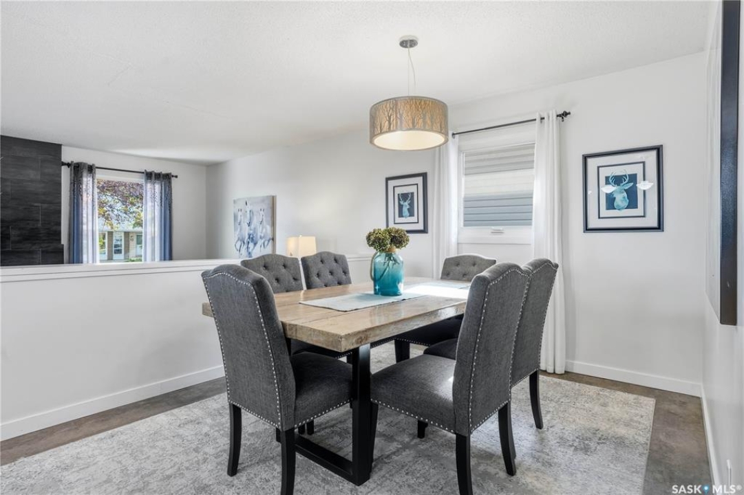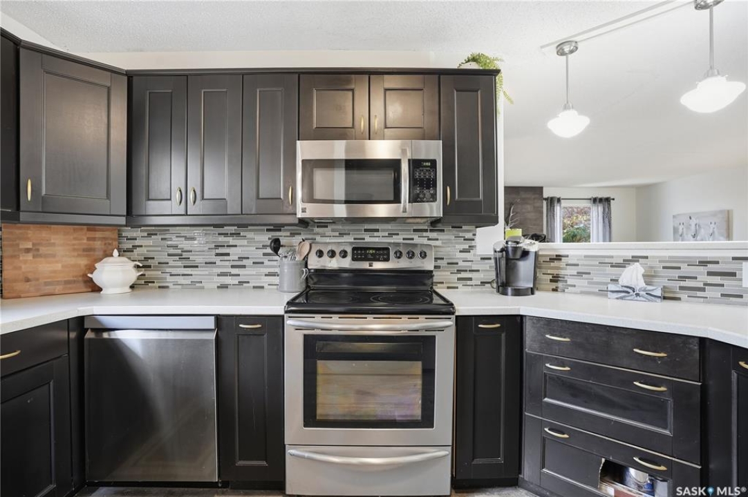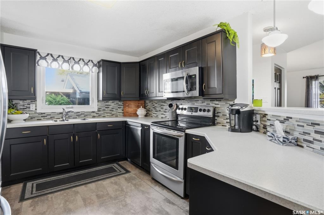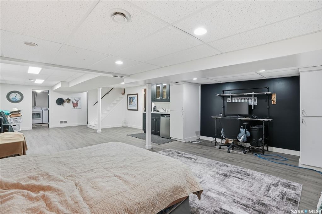 Welcome to this beautifully updated home tucked away on a quiet bay in one of the city's most loved neighbourhoods! The large, private yard is perfect for entertaining, complete with a tandem door off the garage that opens right into your backyard oasis - a patio covered by a pergola with all the furniture included + 3 sheds for storage and a large grassy area perfect for kids and pets. The finished garage provides additional storage + a place for comfortable off-street parking. Inside, you'll find an inviting open-concept layout with a cool, modern-luxurious vibe. A beautifully updated kitchen features glass tile back splash, stainless steel appliances + a complimentary dedicated dining area. The cozy, sunken living room is accented by a tiled fireplace alongside large windows providing natural light. The rest of the main floor offers a primary room with a 2pc ensuite, plus two good-sized bedrooms, ample storage throughout, and an updated 4pc bathroom. Some recent updates include carpet in the bedrooms, fresh paint, updated baseboards, and modern lighting. The fully developed basement is ideal for older kids or guests, featuring a spacious rec room with a wet bar, an additional bedroom, and a stylish 3-piece bath with tiled shower. Major updates to this home include shingles (2019) central A/C, washer & dryer, and an exterior refresh with new paint (all 2025). Located close to great schools, parks, and north-end amenities, this home perfectly blends comfort, function, and location.