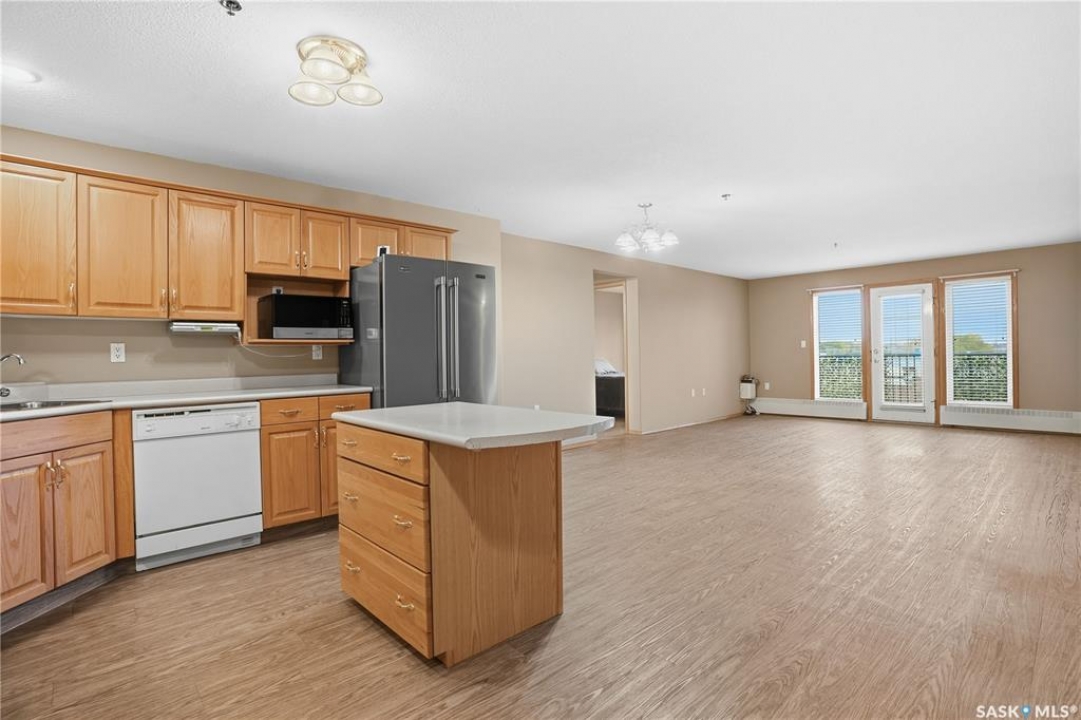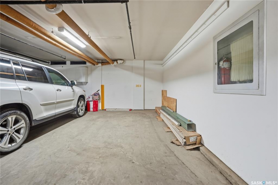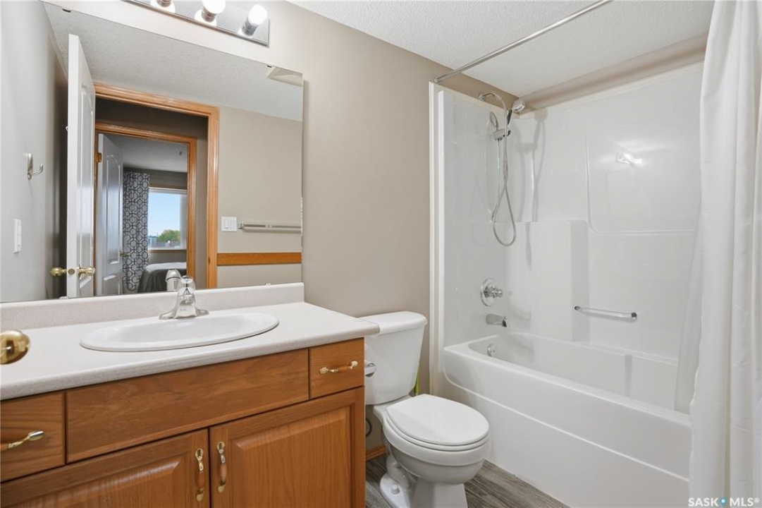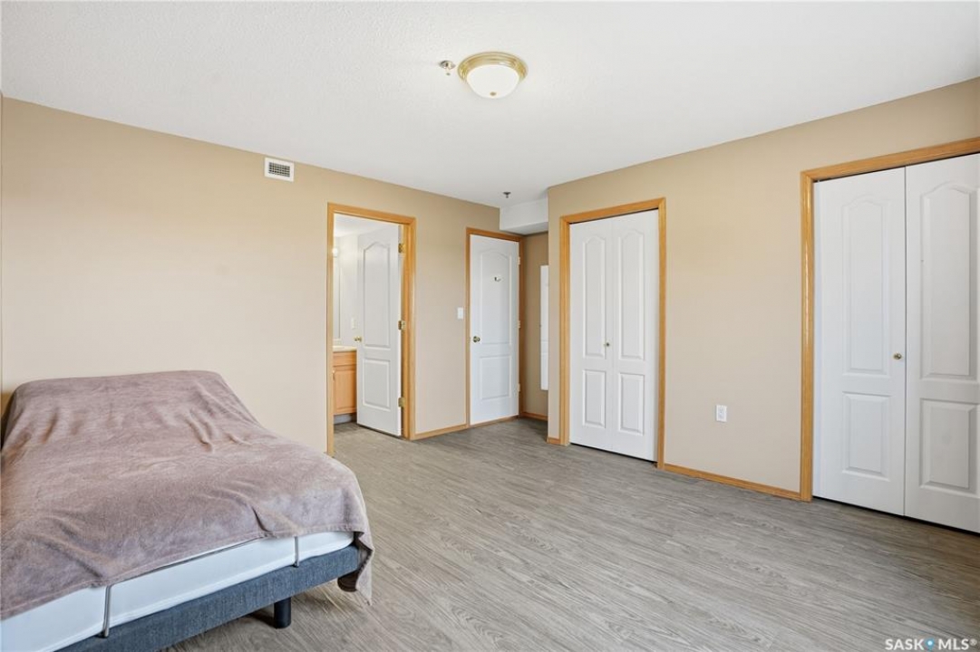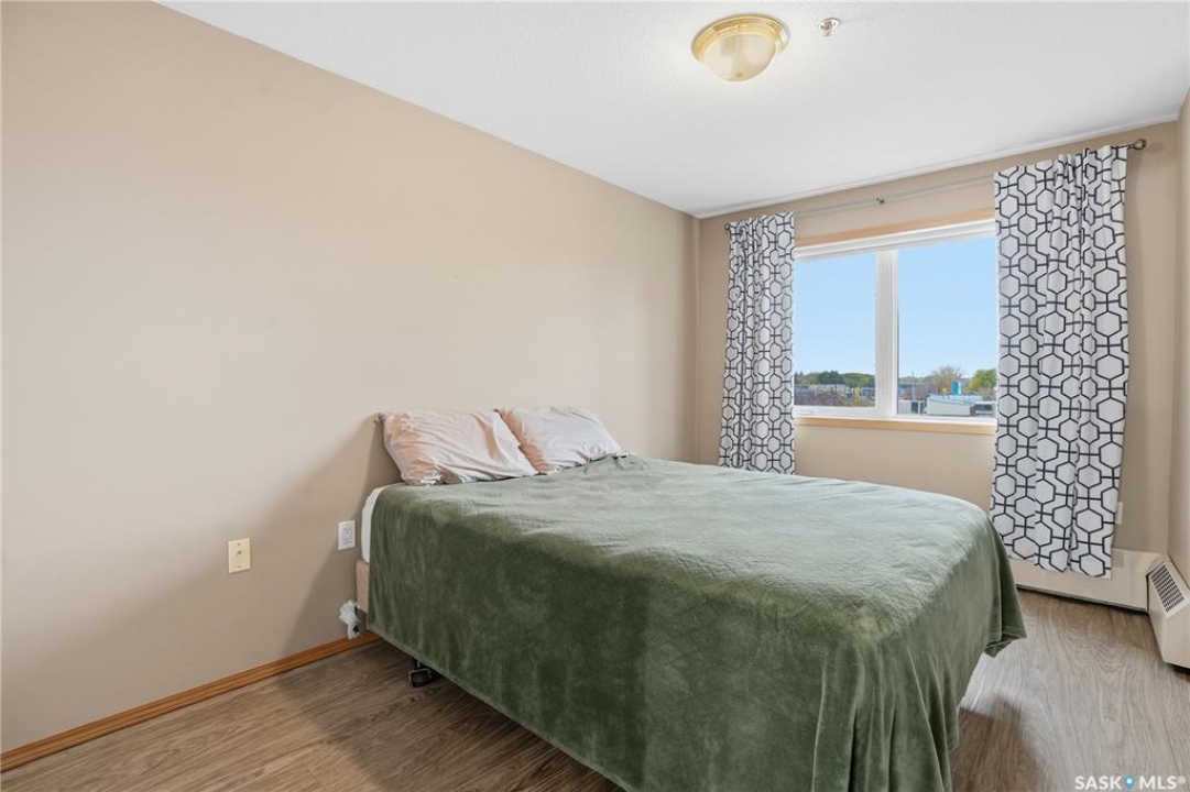Welcome to this spacious and beautifully maintained 2-bedroom, 2-bathroom condo, ideally situated just steps from amenities and public transit. Step inside to a bright, open-concept living, dining, and kitchen area that's perfect for both relaxing and entertaining. The functional kitchen offers plenty of counter and cabinet space, making meal prep a breeze. Enjoy the comfort of upgraded vinyl plank flooring that flows throughout the main living areas, adding a modern and stylish touch. The primary bedroom features plenty of closet space and an ensuite complete with a sleek new walk-in shower. A second bedroom and full bathroom provide excellent space for guests or a home office. Additional highlights include in-suite laundry, central air conditioning, and a large private balcony—perfect for morning coffee or evening sunsets. You'll also appreciate the convenience of heated underground parking, especially during Saskatchewan winters. Condo fees include heat and water, offering excellent value and peace of mind. Located within a block of shopping, restaurants, and a bus stop, this home combines comfort, convenience, and low-maintenance living.