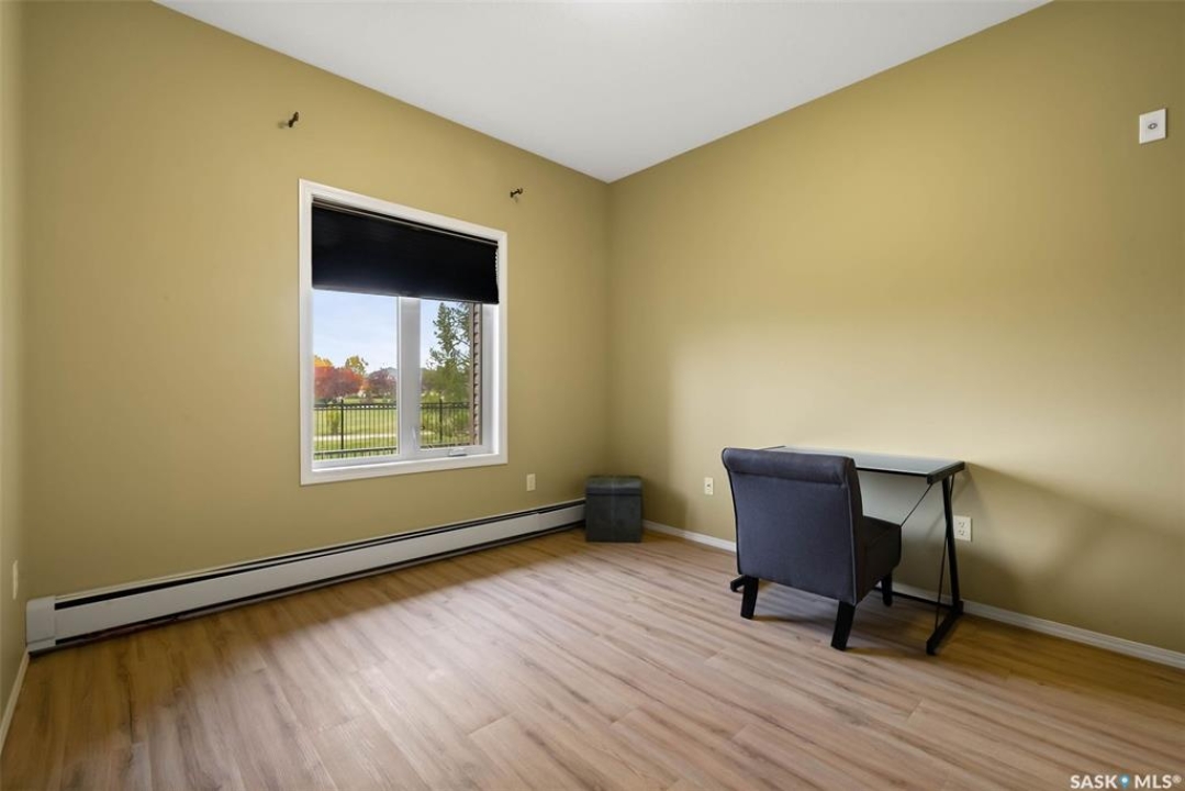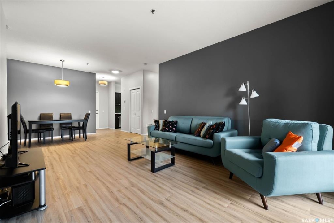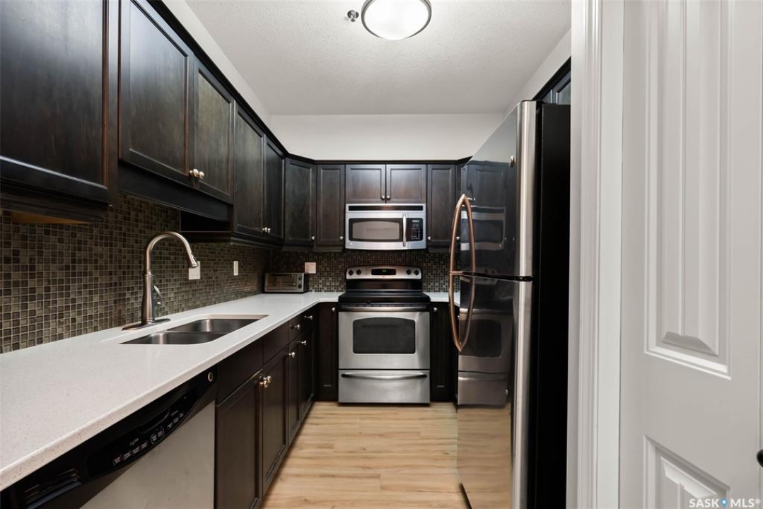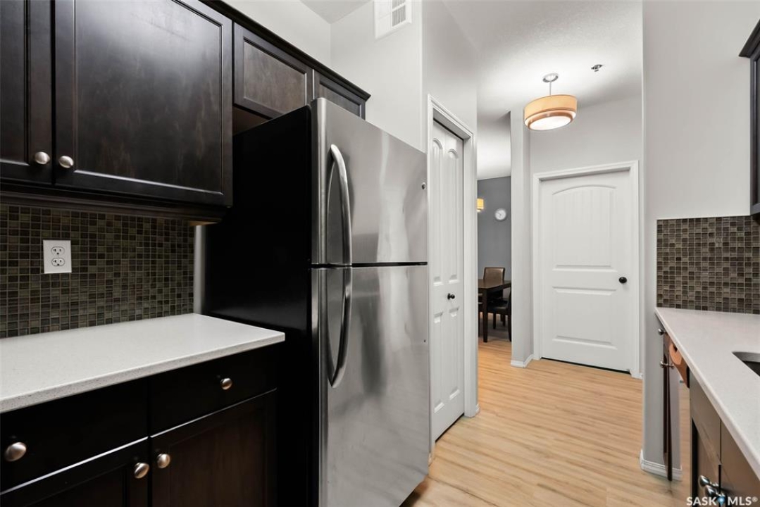 Welcome to this beautiful main floor condo in the desirable Lakeridge area! This 1,030 sq ft, two bedroom apartment style unit offers a bright and open layout, ideally located close to shopping, restaurants, grocery stores, and coffee shops. Positioned on the west side of the building, it overlooks peaceful park space. The kitchen features maple cabinetry, quartz countertops, and stainless steel appliances, opening to the dining area and spacious living room. From the living room, step out to your covered patio with a convenient storage/utility room. The primary bedroom includes a 3 piece ensuite and walk-in closet, while a second bedroom, 4 piece main bath, and in-suite laundry/storage room complete the home. Enjoy one underground parking stall, access to the main floor lounge, and the fitness room in the East building. Condo fees cover heat, water, sewer, exterior and common area maintenance, lawn care, snow removal, building insurance, and the reserve fund.