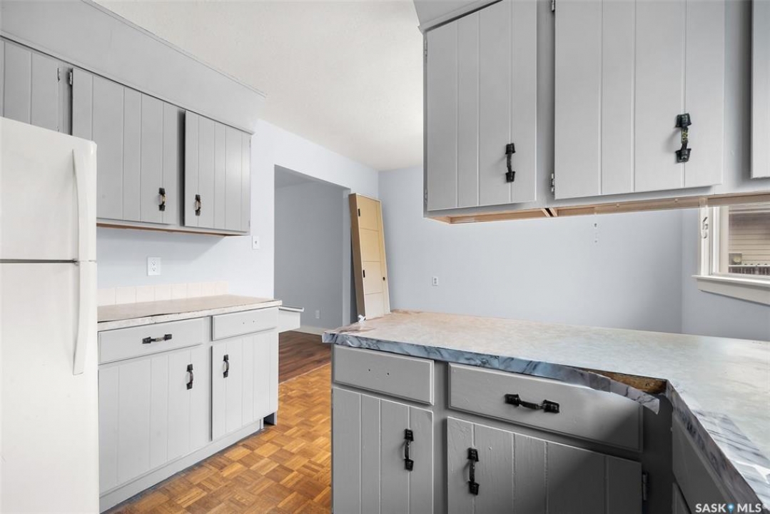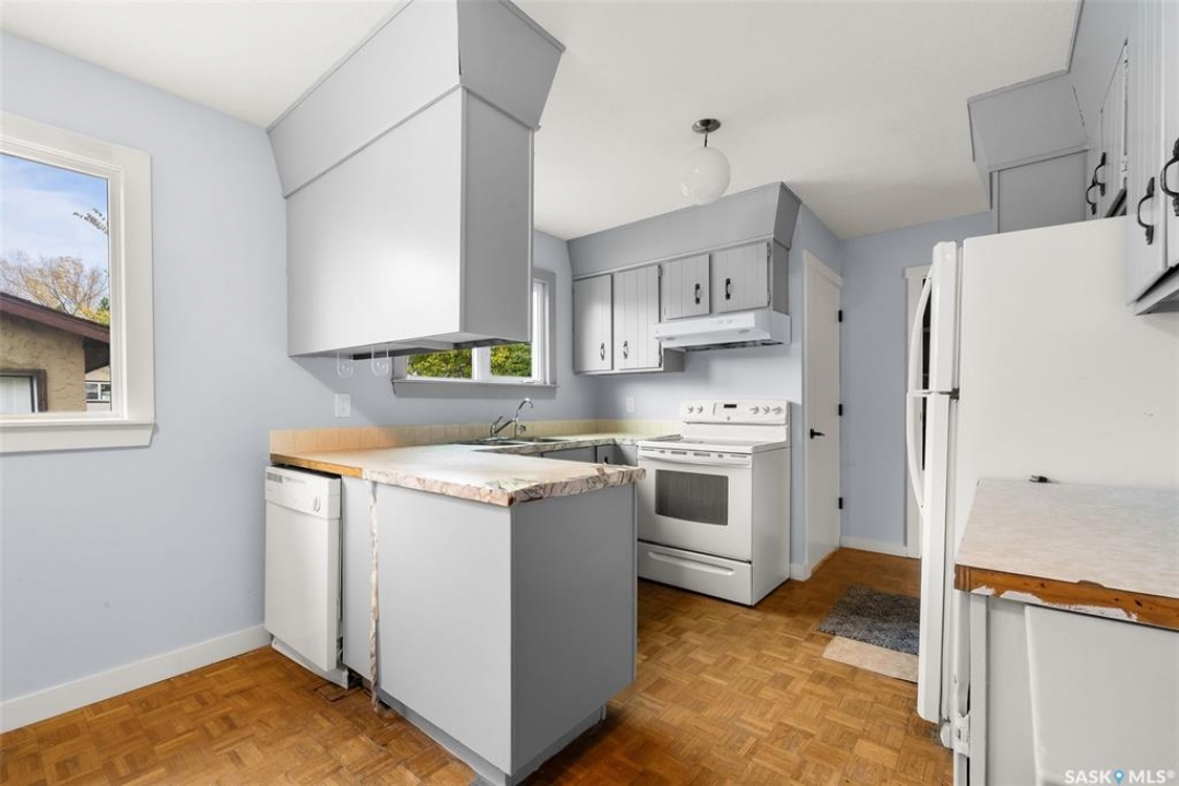 Welcome to 1307 Fleet Street in Regina's Glencairn Village—an opportunity-filled bungalow with a smart layout, mature lot, and tons of upside. The main floor welcomes you with a bright living room framed by a large picture window, an eat-in U-shaped kitchen, and three comfortable bedrooms including a convenient 2-piece ensuite off the primary, plus a full 4-piece bath. Downstairs adds excellent flexibility: a long rec room for movie nights or play space, a den/home office, a 2-piece bath, and a large laundry/utility room with great storage. A key highlight is the separate rear entry to the basement, creating privacy for guests or extended family and strong income potential for future suite development (buyer to confirm local requirements and permits). Outside, you'll appreciate the fenced yard with patio and mature trees, plus a double detached garage and an extended driveway for ample off-street parking. The location is close to neighbourhood parks, schools, transit, and east-end amenities, with quick access to Arcola Avenue and Ring Road for commuting. This home needs some TLC—think cosmetic updates and personal touches—but the fundamentals are here: classic bungalow design, full basement with its own entrance, generous lot, and garage. Whether you're a first-time buyer, multigenerational household, or an investor seeking a value-add project, this is a compelling canvas to make your own.