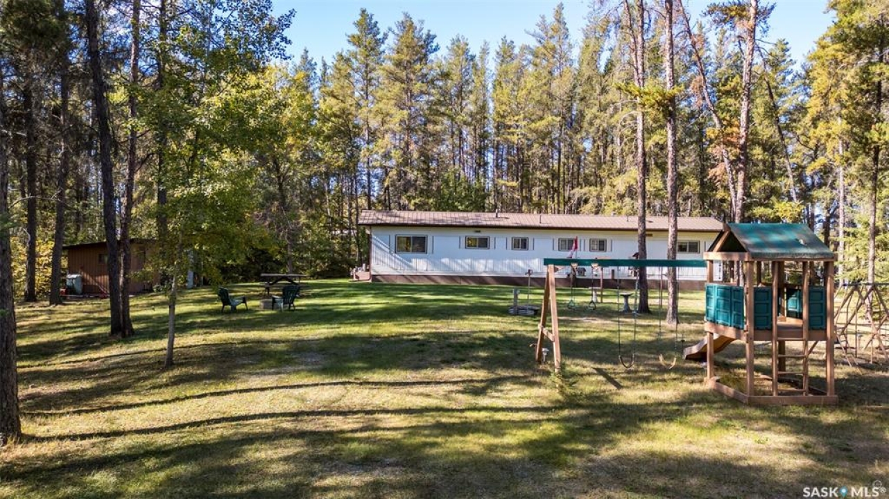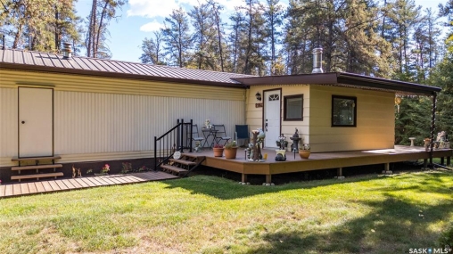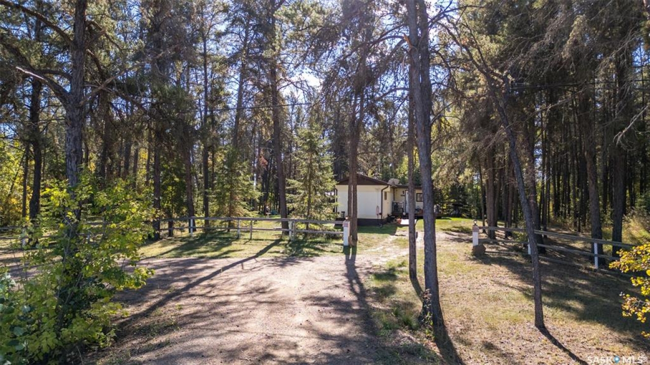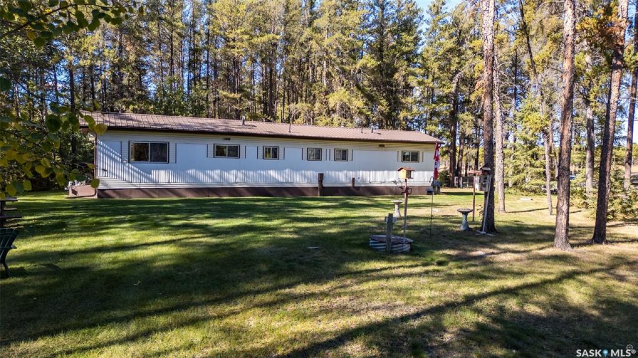 Just 10 minutes from Prince Albert, this well maintained 4 bedroom and 1 bathroom mobile home offers country living with convenience. The expansive living and dining area is filled with natural light from large windows and seamlessly flows into the spacious kitchen that has plenty of storage space. There are 4 comfortable bedrooms and a bright white 4 piece bathroom. Nestled on 1.5 acres, this fully fenced property is surrounded by 200–300 mature trees, precisely planted throughout the landscape to provide both privacy and natural beauty. A sprawling deck and firepit area create ideal spaces for outdoor gatherings, while the added bonus of a heated 7 ft x 18 ft shed adds valuable storage or workspace options. Water is supplied through a shared well located on the adjacent lot and the sewer system is a septic field to a septic tank. Situated near the North Saskatchewan River and the Nisbet Provincial Forest, this home offers a peaceful retreat close to nature. The adjacent lot is also available for purchase (MLS # SK021153), providing an exciting opportunity to expand your space. Act now, make this your next move!