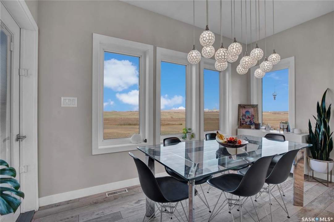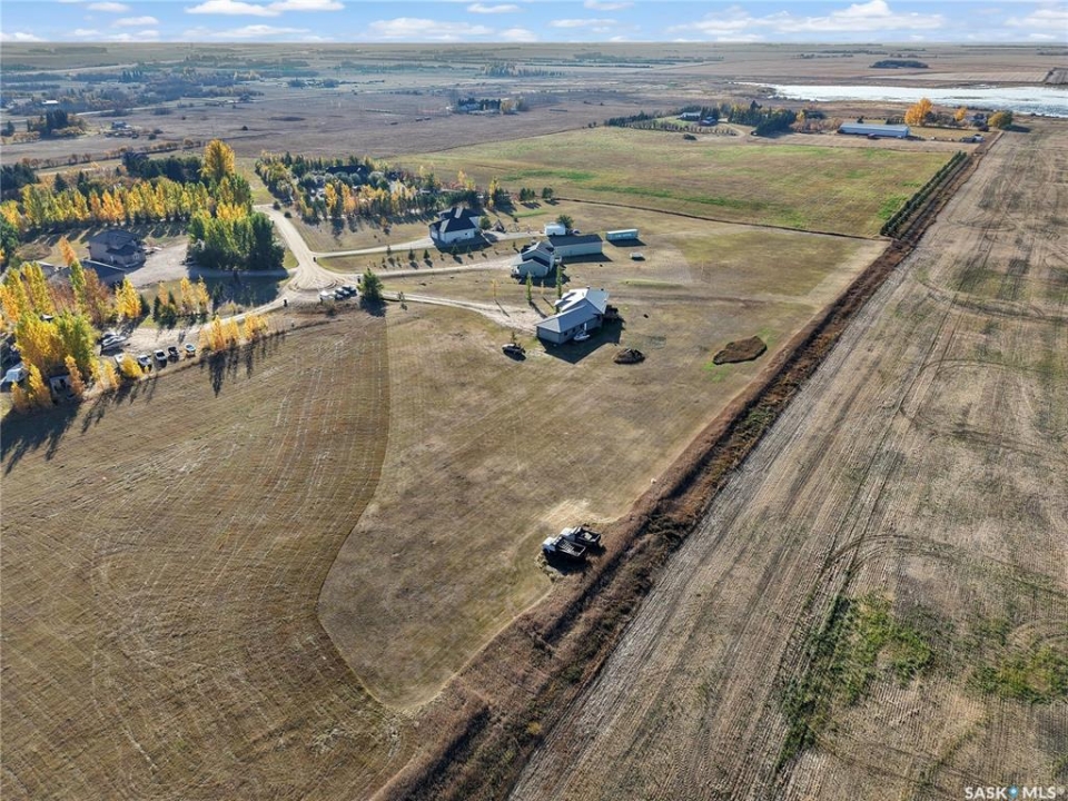 Sitina Estates is a hidden gem just minutes from Saskatoon, accessible via a double-lane highway. This 1880 sq ft bungalow is impeccably finished, featuring six bedrooms and three bathrooms. Located at the back of a cul-de-sac, the property offers exceptional curb appeal with a stucco and stone exterior and staggered garage doors on the triple-attached garage. The front door opens into a spacious tiled foyer with a striking two-sided gas fireplace, shared with the large living room, which is part of the open-concept main floor. The custom kitchen showcases quartz countertops with an island that includes bar seating, gloss-finish white cabinets, a built-in oven and microwave, a hood fan, and a gas range. A walk-through pantry provides easy access to the laundry/mudroom, which connects directly to the attached garage. The dining room is designed with large windows to maximize the natural views and provides access to a generously sized rear deck. Down the hallway, you'll find a four-piece bath and three bedrooms, including the primary suite, which boasts a walk-in closet and an ensuite with dual sinks, high-end fixtures, a Bain Ultra air tub, and a shower space awaiting your tile selection. The basement is nearly complete, with three additional bedrooms and a fully finished four-piece bath. The family room and den have exterior walls and electrical work already in place, leaving an opportunity for a handy buyer to add finishing touches. This quiet development, located just minutes from Saskatoon and the Vanscoy mine, offers the perfect balance of accessibility and the tranquility of acreage living with 2.6 acres to call your own. Call today for a private showing.