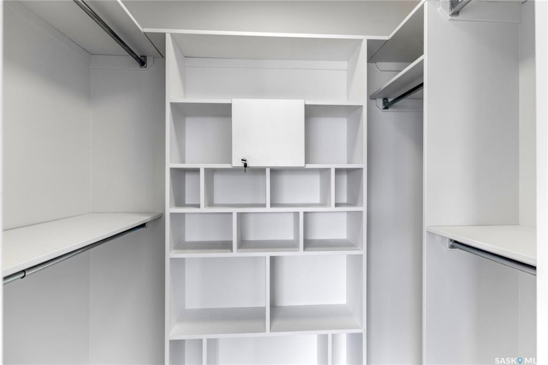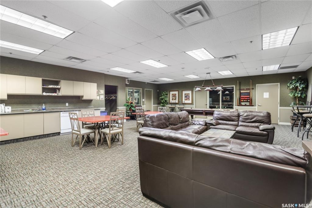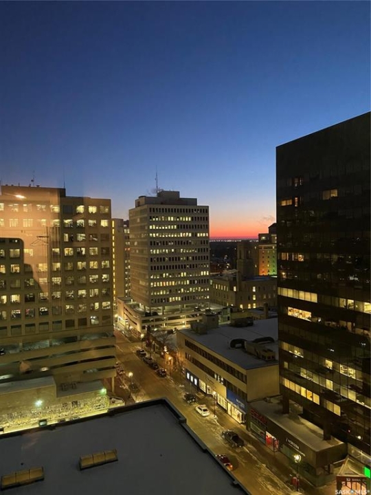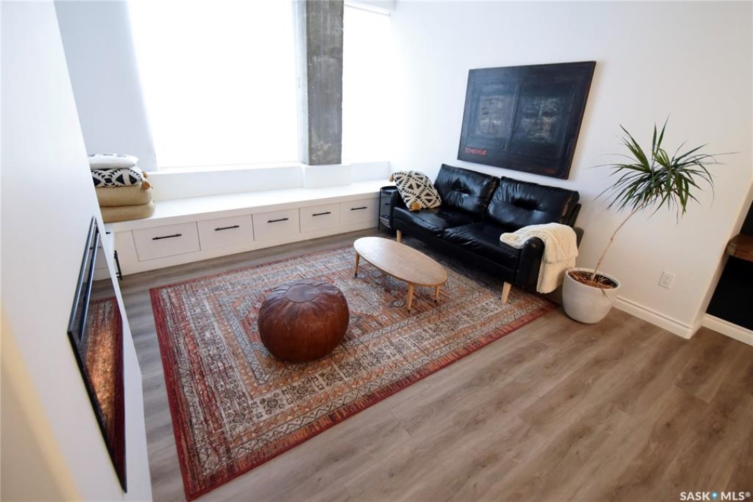 Featuring amazing views of the Regina skyline, this south facing executive condo takes in the sunset and sunrise and has been extensively renovated from top to bottom! Immediately when you walk in you will see a built-in entry bench with hooks and access to the in-suite laundry. The custom kitchen includes new quartz countertops with water fall edge and slab backsplash, stainless steel Amana appliances (refrigerator, stove, microwave and dishwasher), wooden shelving, a coffee station and sleek modern two tone cabinets that go right to the ceiling. The dining area includes a built-in banquette with storage so the amazing view can be enjoyed while you eat. The office area includes a feature wall and a custom wooden desk and shelves. The living room includes a built-in window seat with storage, a built-in tv bench and an electric fire place for those extra cold winter days. The bathroom has been tastefully updated with new paint, new mirror and lights. There is an extra deep soaker tub/shower as well. The bedroom features an amazing custom walk-in closet, with both shelving and rod storage. Condo fees include water and heat, and access to a full 24/7 gym, a social room with pool table, a roof top patio with BBQs and a hot tub and a Monday to Friday (8am-4pm) concierge at the entry. This unit comes with central air conditioning and one outdoor parking spot right outside the building in a secured gated lot. It also includes a 3x5 foot storage locker in the basement. Schedule your showing today!
