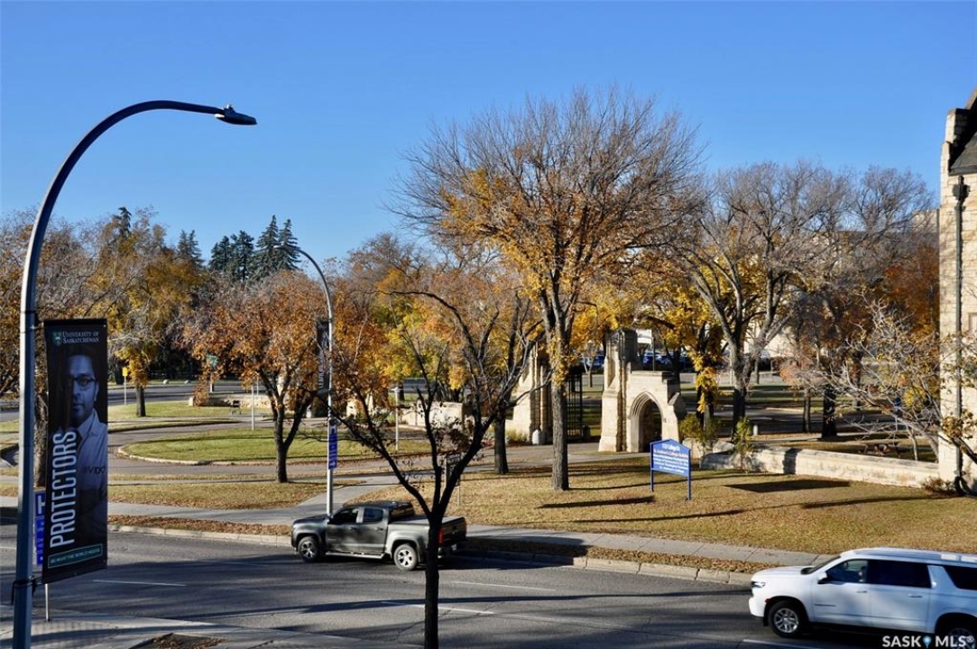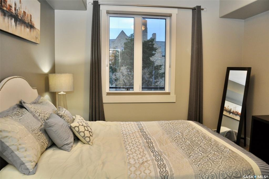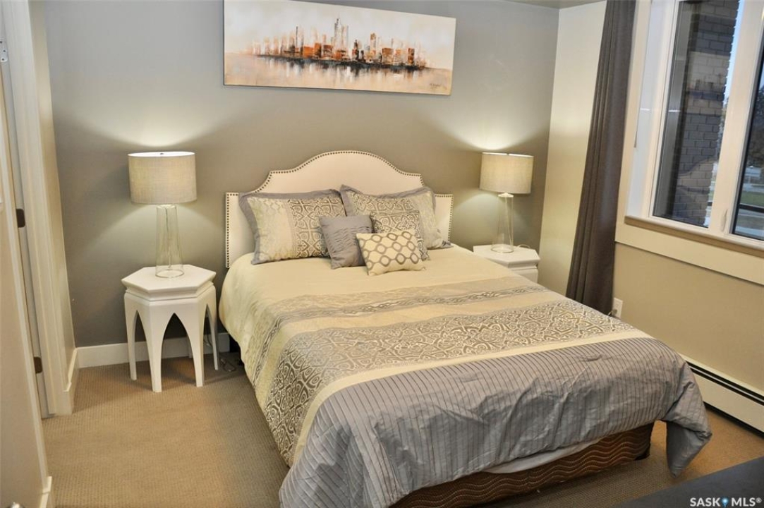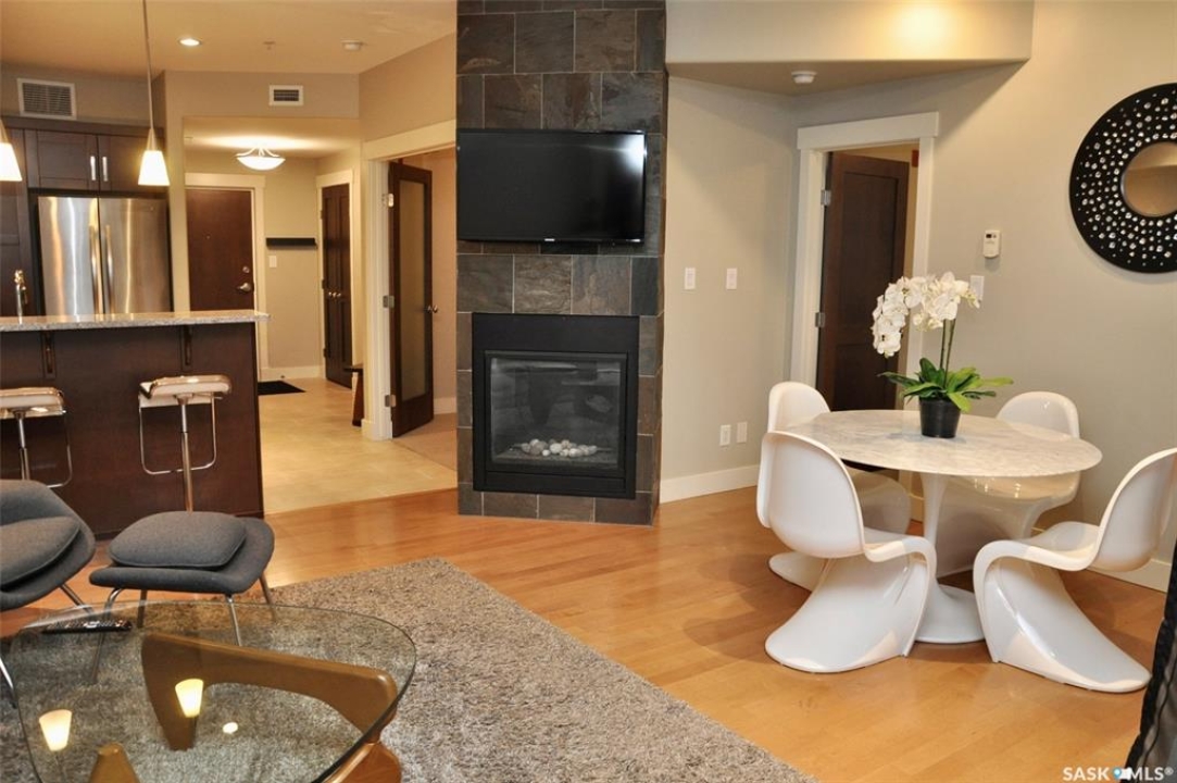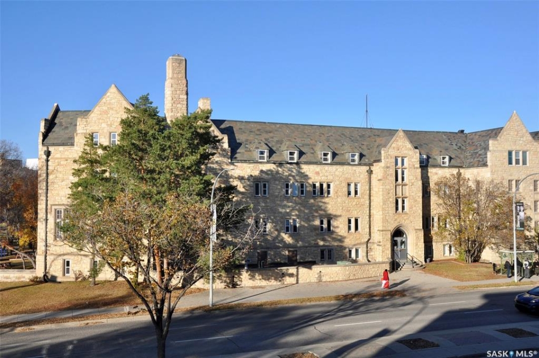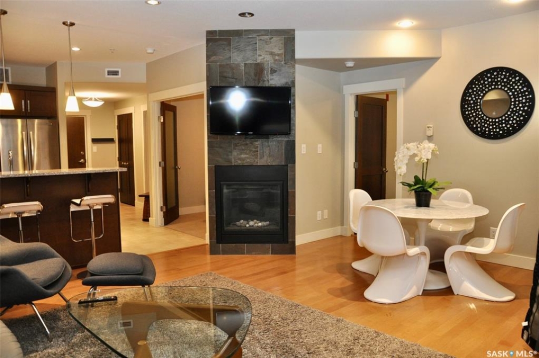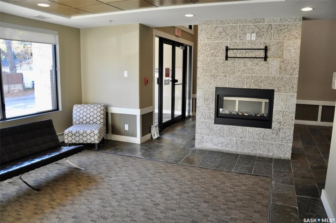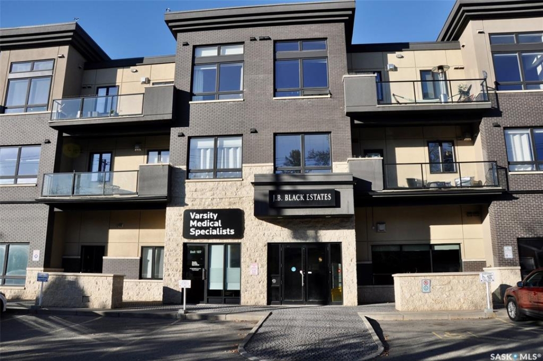 Welcome to this lovely condo in J.B. Black Estates situated across the street from the University of Saskatchewan and both Royal University and Jim Pattison Children's Hospitals. Ideally located within close proximity to downtown, river valley and walking trails and the vibrant Broadway District, this great unit offers two bedrooms two baths large bright open living area featuring hardwood and tile floors. natural gas fireplace, ample kitchen cabinets with granite counter tops, snack bar and tile backsplash and offers stainless steel appliances with natural gas range plus 9 ' ceilings. The primary bedroom has double walk thru closets leading to a spa like ensuite with 6'ft jet tub. double sinks, granite counter tops and heated tile floors. The main bathroom has a walk in shower with body jets and full glass doors. Also includes a large storage room/ laundry room, one underground parking stall and storage locker plus natural gas on balcony for your bbq or grill. Call your Realtor to view this fine condo today!