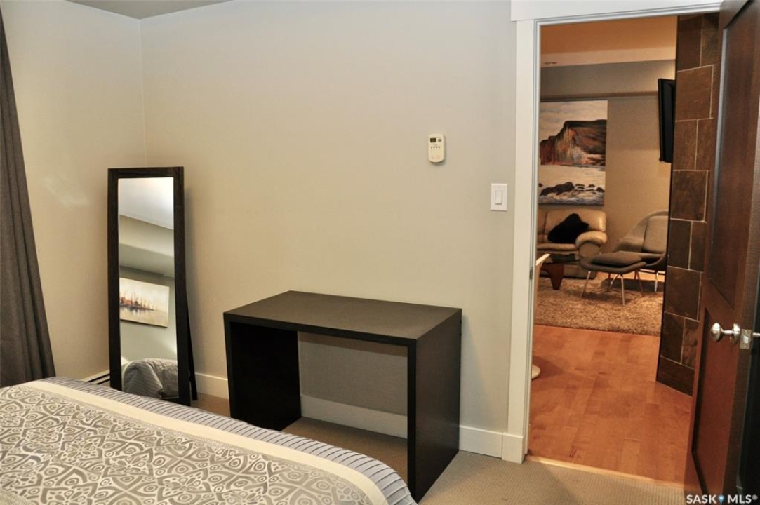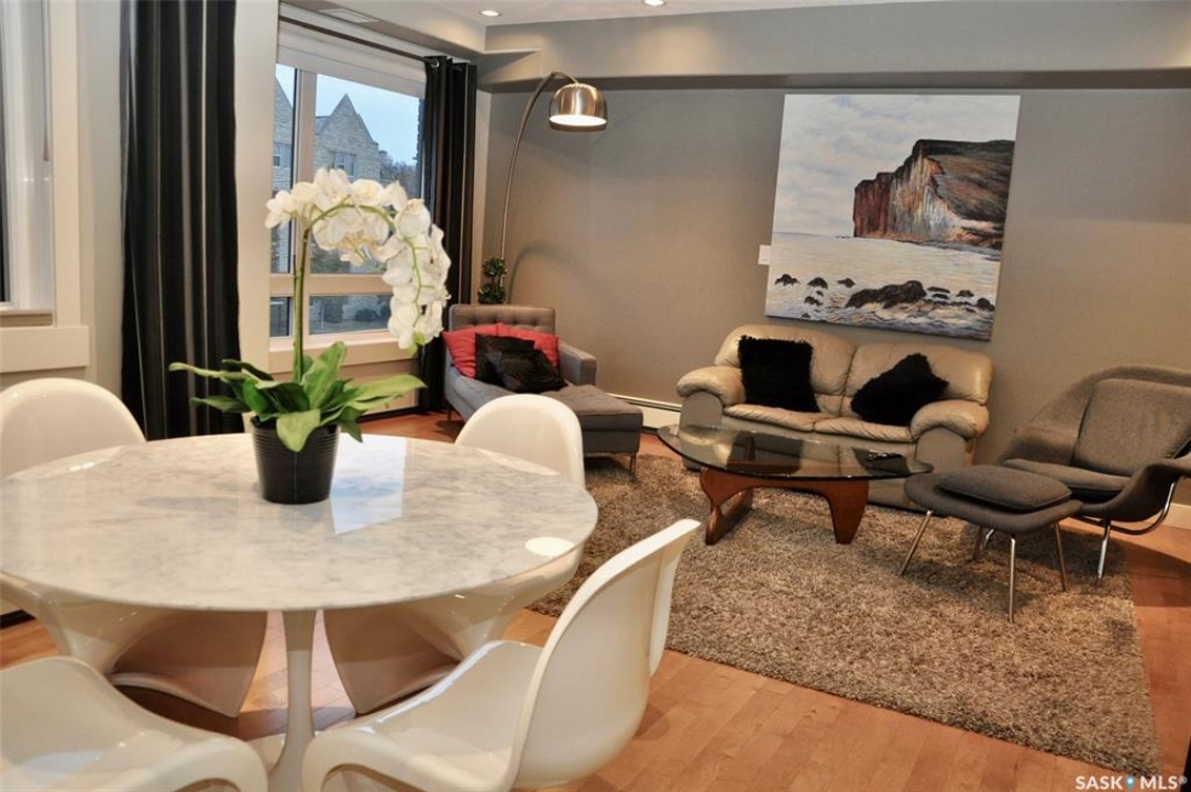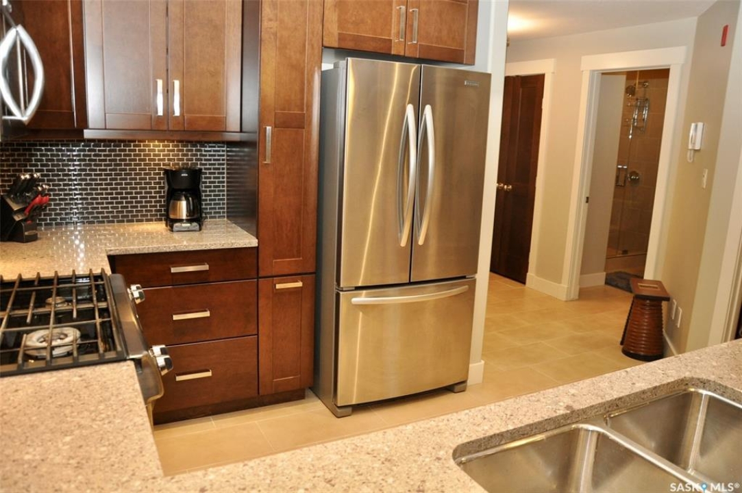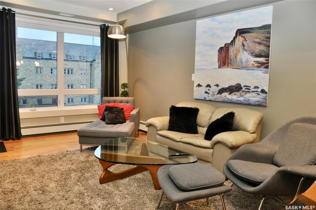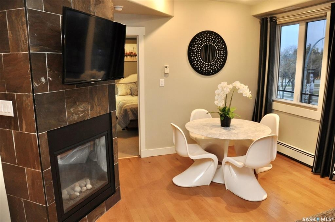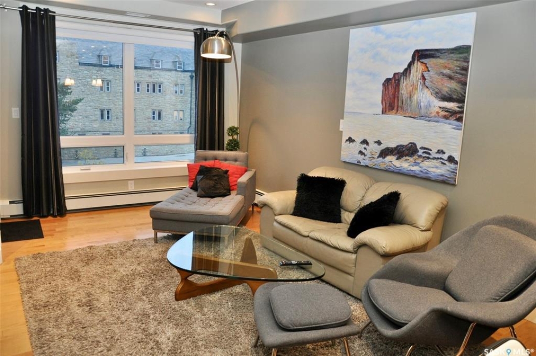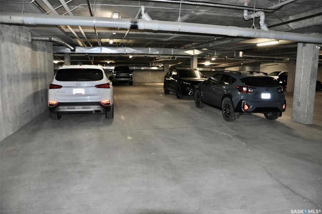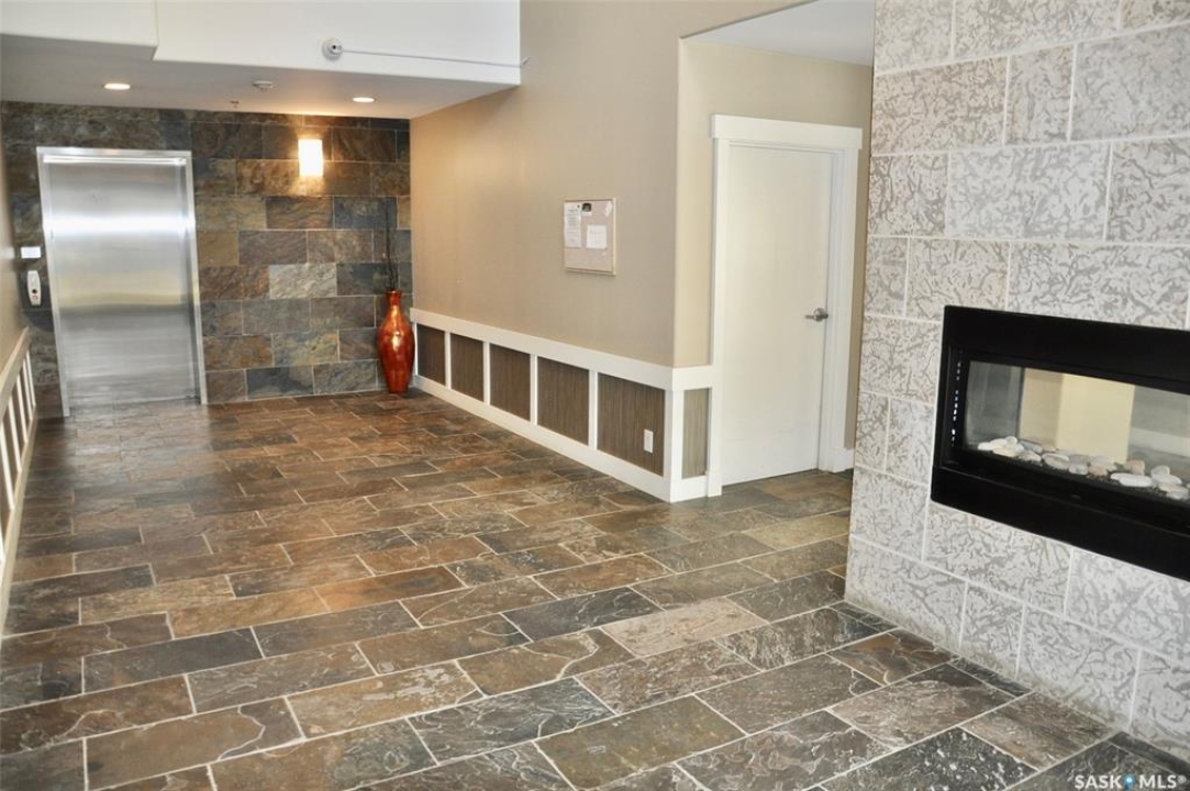 Welcome to this lovely condo in J.B. Black Estates situated across the street from the University of Saskatchewan and both Royal University and Jim Pattison Children's Hospitals. Ideally located within close proximity to downtown, river valley and walking trails and the vibrant Broadway District, this great unit offers two bedrooms two baths large bright open living area featuring hardwood and tile floors. natural gas fireplace, ample kitchen cabinets with granite counter tops, snack bar and tile backsplash and offers stainless steel appliances with natural gas range plus 9 ' ceilings. The primary bedroom has double walk thru closets leading to a spa like ensuite with 6'ft jet tub. double sinks, granite counter tops and heated tile floors. The main bathroom has a walk in shower with body jets and full glass doors. Also includes a large storage room/ laundry room, one underground parking stall and storage locker plus natural gas on balcony for your bbq or grill. Call your Realtor to view this fine condo today!