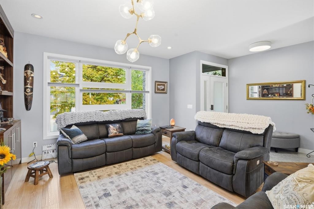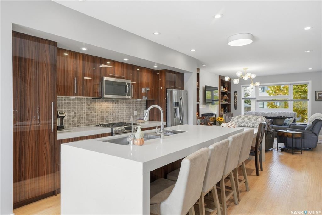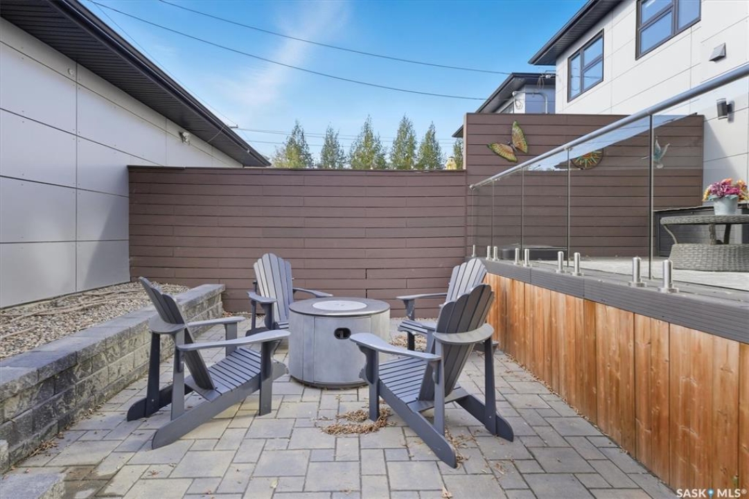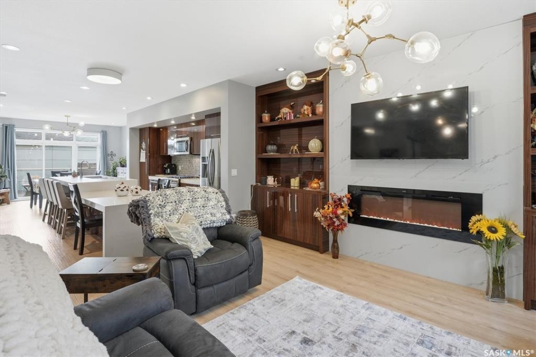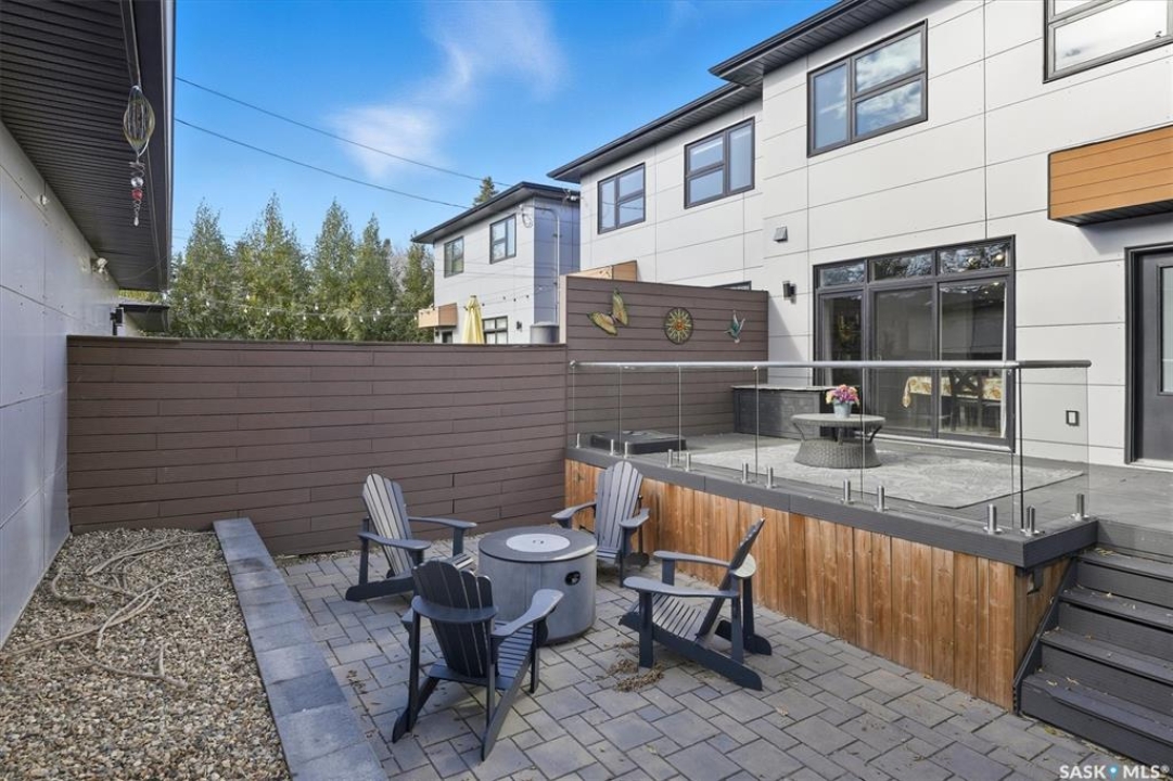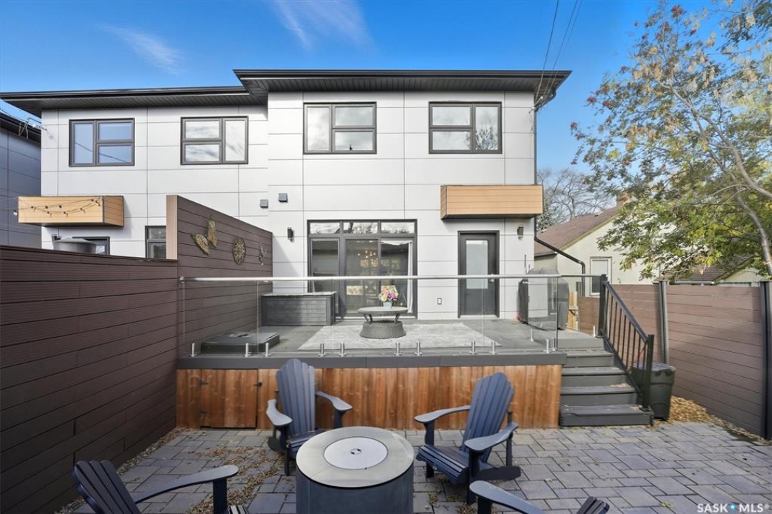 Welcome to 1106 7th St E. This stunning 1,897 sq. ft. semi-detached two-storey offers modern style and exceptional craftsmanship in the established Haultain neighbourhood. The bright, open concept main floor features 9-ft ceilings, large windows, and a stylish electric fireplace with built-in shelving. The chef's kitchen boasts high gloss cabinets, a massive quartz island, tile backsplash, and stainless steel appliances including a gas range. French doors off the dining area lead to a south-facing, maintenance-free deck and an insulated double detached garage. Upstairs, the primary suite impresses with a walk-in closet and spa-like 5-pc ensuite featuring a soaker tub, glass shower, and double sinks. Two more spacious bedrooms, a 5-pc main bath, and 2nd floor laundry complete this floor. Additional features include no carpet, custom closet organizers, open-tread staircase, pot lighting, and a side entry to the basement with 9-ft ceilings ready for development and a zeroscape yard featuring artificial turf in the front and a custom paving stone patio in the back. Call for your private showing today!!