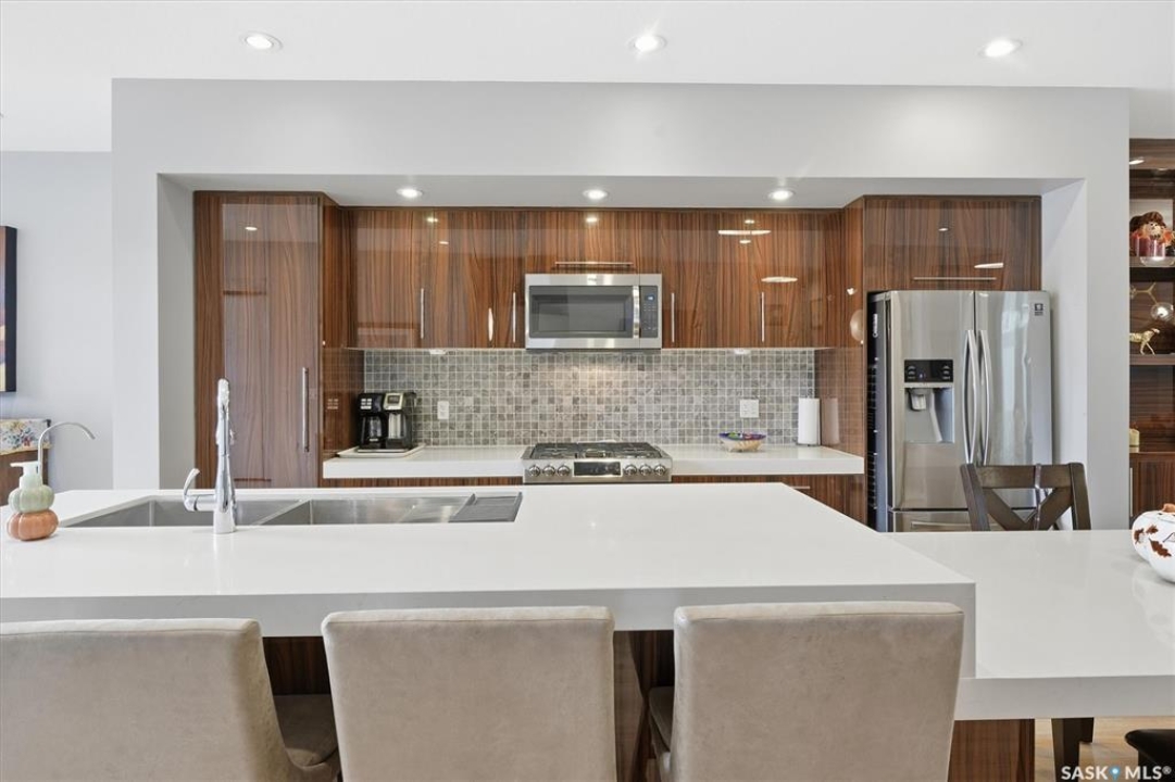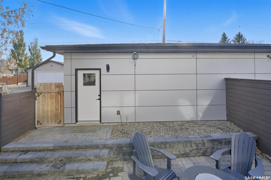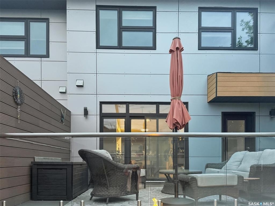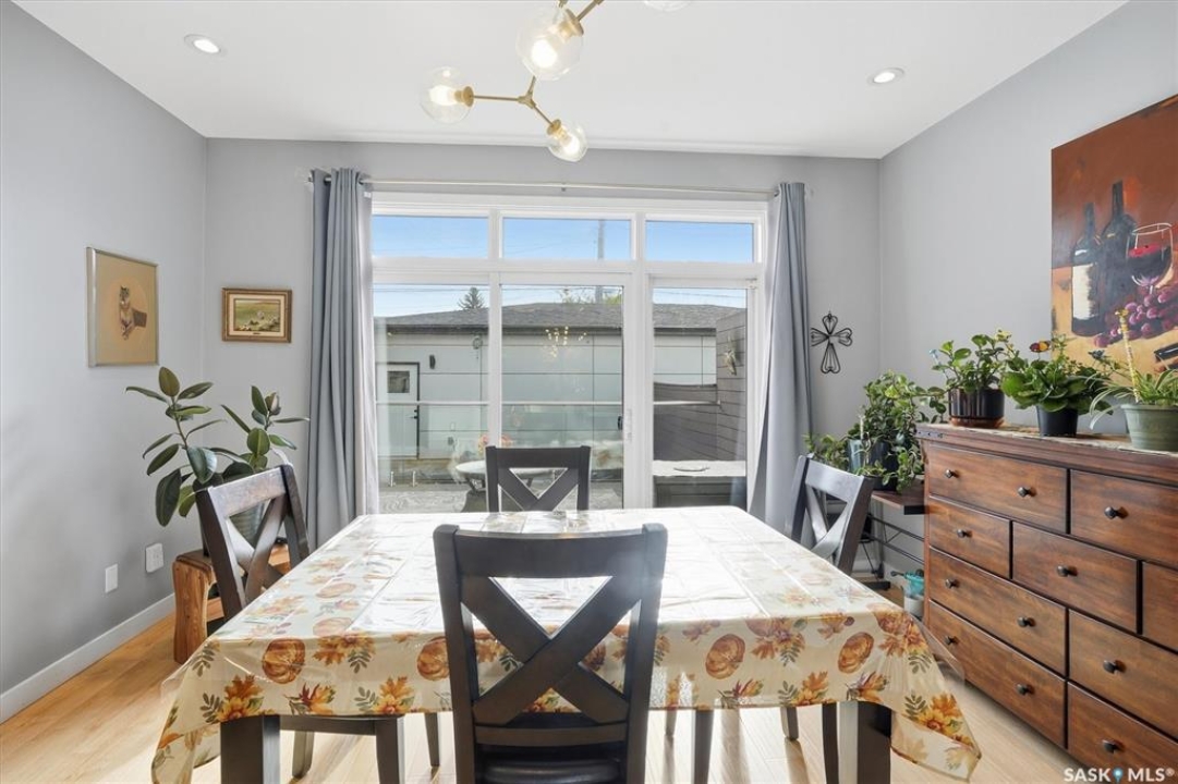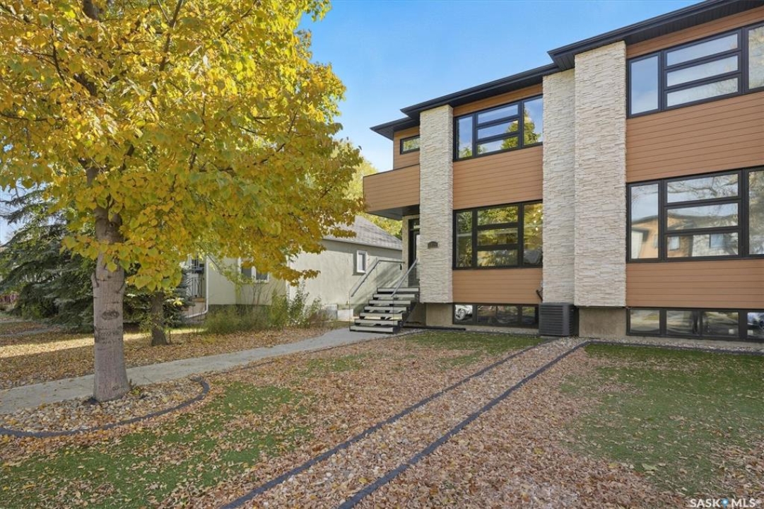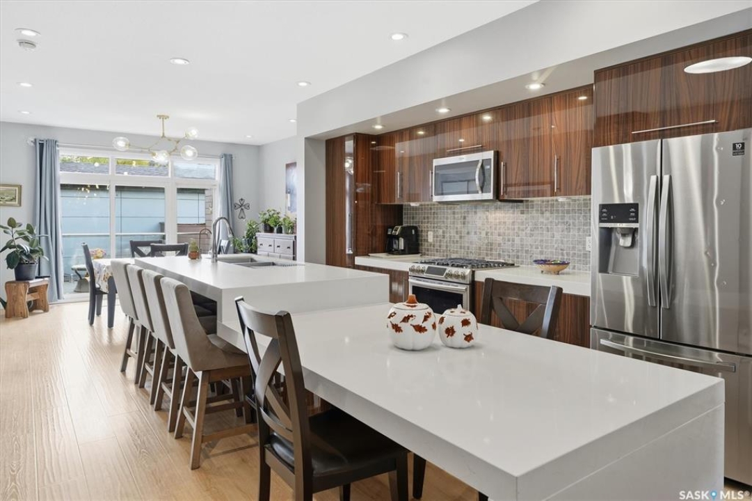 Welcome to 1106 7th St E. This stunning 1,897 sq. ft. semi-detached two-storey offers modern style and exceptional craftsmanship in the established Haultain neighbourhood. The bright, open concept main floor features 9-ft ceilings, large windows, and a stylish electric fireplace with built-in shelving. The chef's kitchen boasts high gloss cabinets, a massive quartz island, tile backsplash, and stainless steel appliances including a gas range. French doors off the dining area lead to a south-facing, maintenance-free deck and an insulated double detached garage. Upstairs, the primary suite impresses with a walk-in closet and spa-like 5-pc ensuite featuring a soaker tub, glass shower, and double sinks. Two more spacious bedrooms, a 5-pc main bath, and 2nd floor laundry complete this floor. Additional features include no carpet, custom closet organizers, open-tread staircase, pot lighting, and a side entry to the basement with 9-ft ceilings ready for development and a zeroscape yard featuring artificial turf in the front and a custom paving stone patio in the back. Call for your private showing today!!