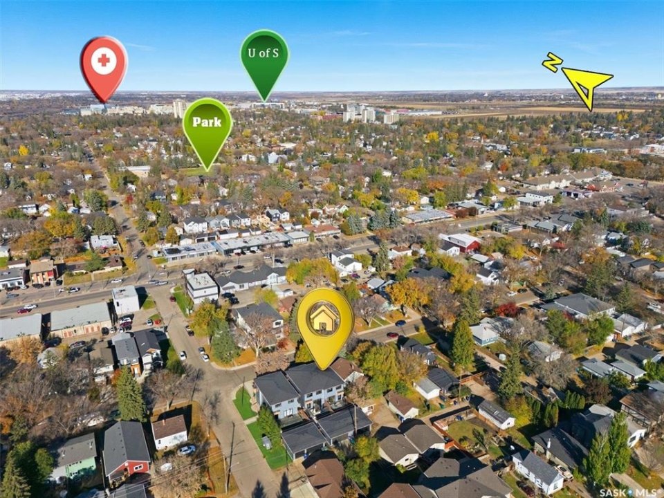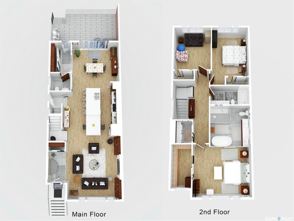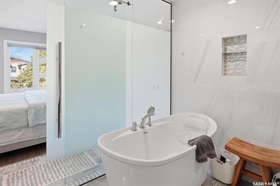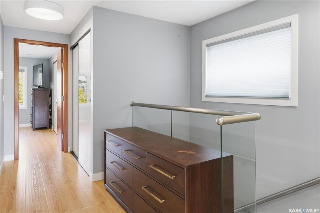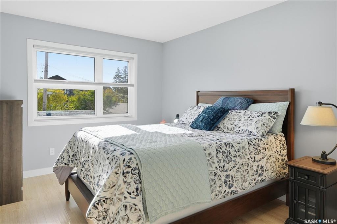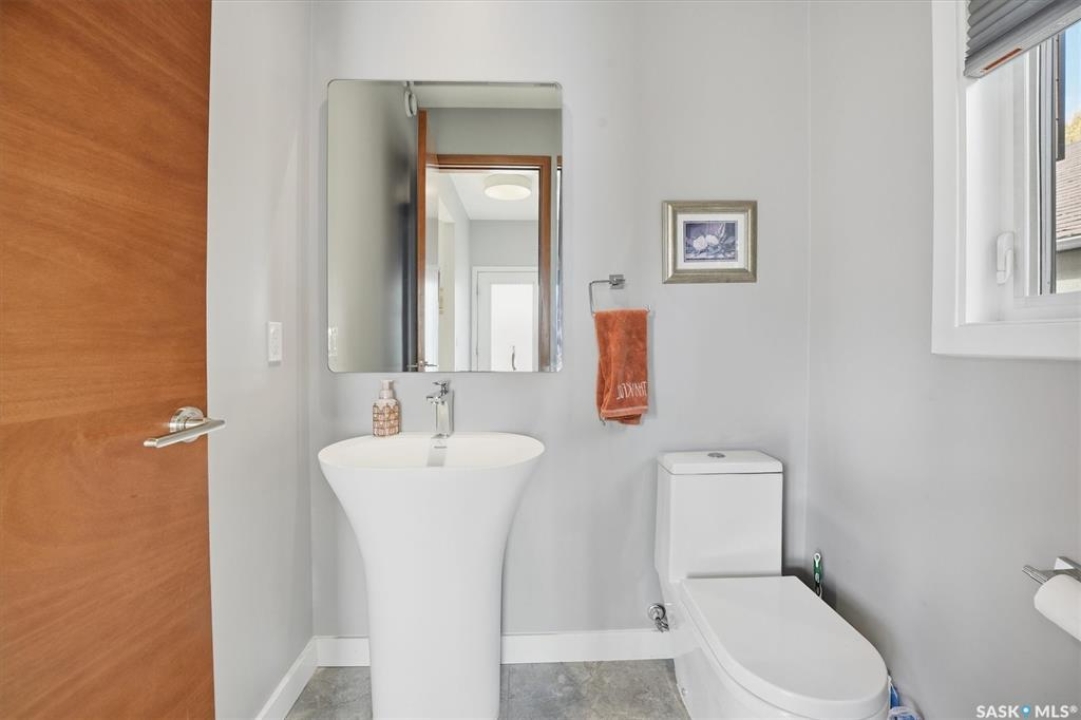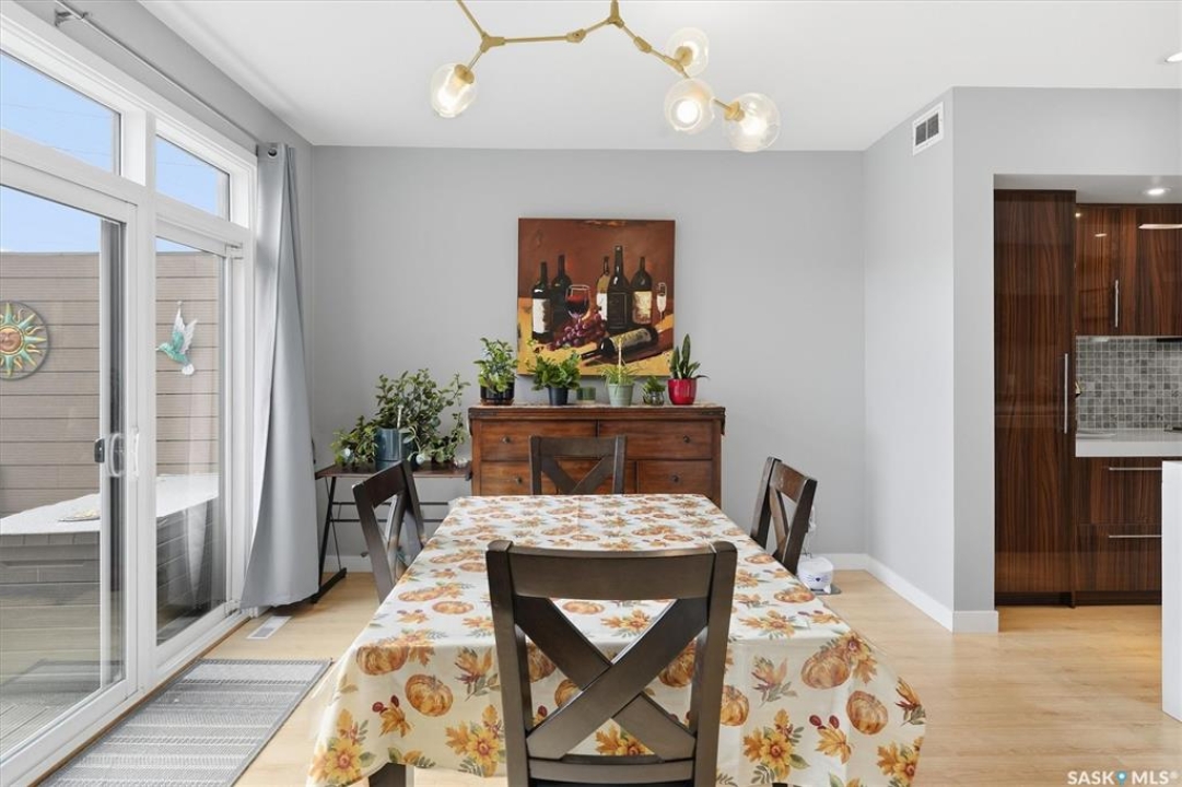 Welcome to 1106 7th St E. This stunning 1,897 sq. ft. semi-detached two-storey offers modern style and exceptional craftsmanship in the established Haultain neighbourhood. The bright, open concept main floor features 9-ft ceilings, large windows, and a stylish electric fireplace with built-in shelving. The chef's kitchen boasts high gloss cabinets, a massive quartz island, tile backsplash, and stainless steel appliances including a gas range. French doors off the dining area lead to a south-facing, maintenance-free deck and an insulated double detached garage. Upstairs, the primary suite impresses with a walk-in closet and spa-like 5-pc ensuite featuring a soaker tub, glass shower, and double sinks. Two more spacious bedrooms, a 5-pc main bath, and 2nd floor laundry complete this floor. Additional features include no carpet, custom closet organizers, open-tread staircase, pot lighting, and a side entry to the basement with 9-ft ceilings ready for development and a zeroscape yard featuring artificial turf in the front and a custom paving stone patio in the back. Call for your private showing today!!