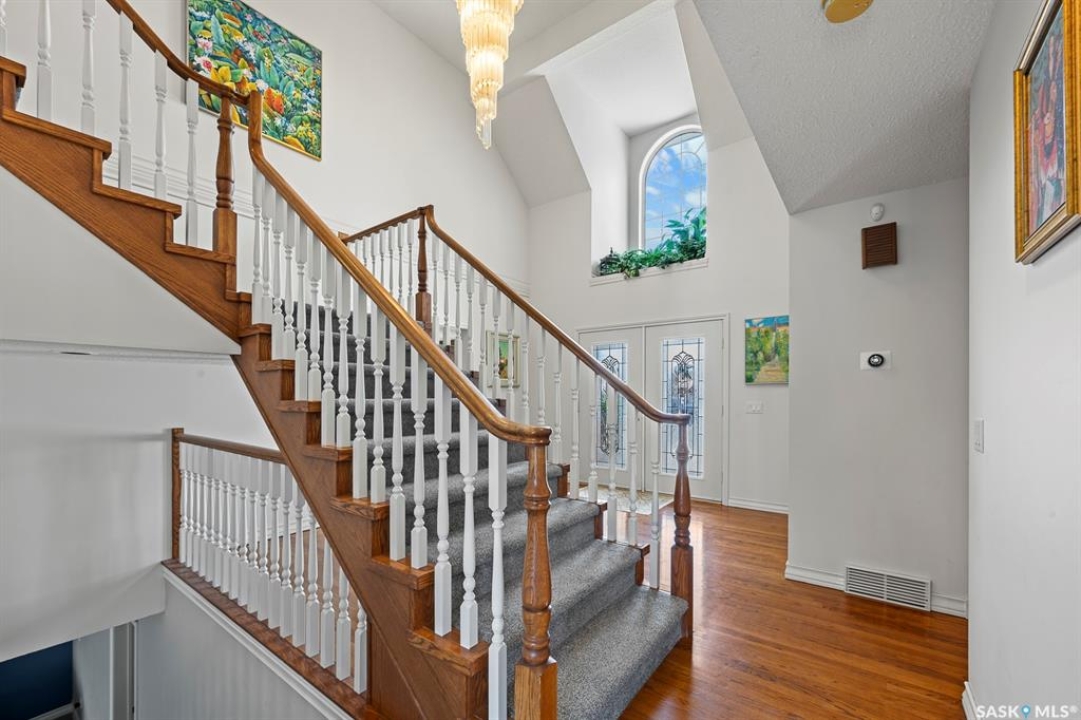 Welcome to this stunning 2-story Walk-out home by Westmount Developments, nestled in the serene bay of Wascana View with a backdrop of lush greenery. This meticulously crafted residence boasts 2765 sqft plus an additional 1536 sqft on the walk-out level. Upon entry, you're greeted by a grand foyer adorned with an open ceiling and a dazzling crystal chandelier, leading seamlessly into the formal living and dining areas adorned with beautiful hardwood flooring. The open kitchen is a chef's dream, featuring white lacquer cabinets, granite countertops, glass-tiled backsplash, and ceramic flooring.The cozy family room offers a new gas fireplace and customized HunterDouglas automated shades, while the newer upper deck with glass railings offers a picturesque view of the green space and inviting heated pool.Ascending to the 2nd level, discover the spacious master bedroom with his and her walk-in closets, complemented by an executive ensuite boasting dual sinks, a jetted tub, and a FIAT steam shower. Two additional large bedrooms and a main bathroom with skylight and dual sinks complete this level.The lower walk-out level is an entertainer's paradise, featuring a recreation room with fireplace and a wet bar, with access to the hot tub and pool. A generous 4th bedroom, versatile den, and a beautifully landscaped backyard with composite wood deck and hot tub complete this exceptional home. Renovations abound, including a Cedar shake roof by Wheatland Roofing (2011), triple-pane windows on the main and 2nd floors (except DI & LR), HunterDouglas smart motorized blinds, new paint and upgraded carpet throughout (2020), 2 new fireplaces, a high-efficiency furnace (2020), and newly upgraded high-end vanities and toilets.Don't miss the opportunity to make this your dream home. Contact your agent to schedule a private showing today!