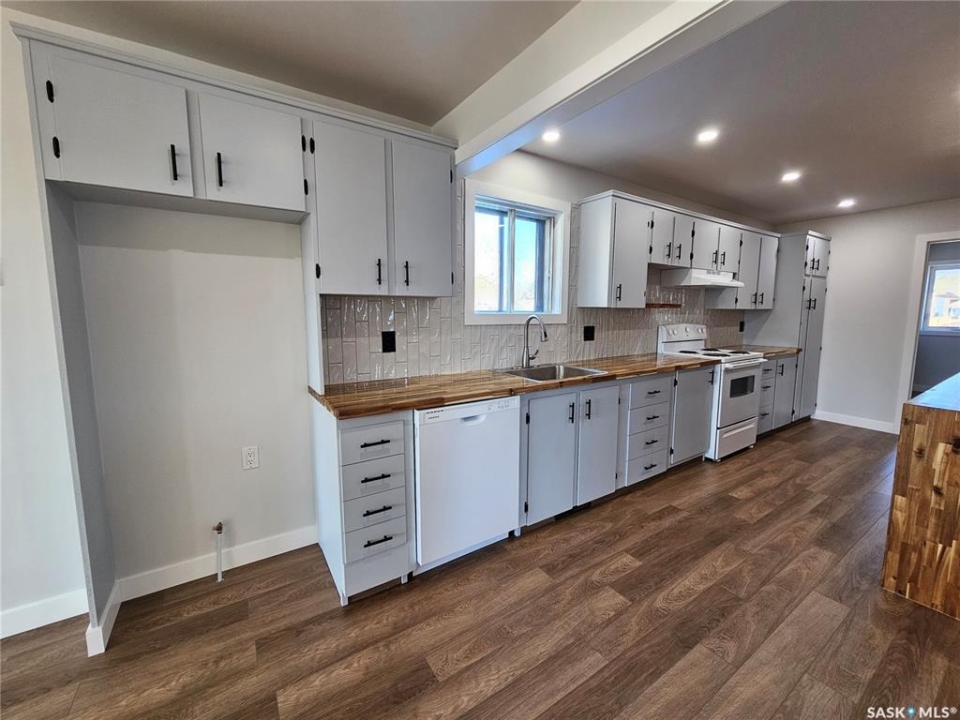 Don't be fooled by the stature of this one's frontage! This home is SPACIOUS inside! This 1444 square foot bungalow has not only seen an addition in its past (2007) bringing it up in size, but also, the whole main floor just saw a massive transformation in aesthetics and functionality in 2025. The current owner eliminated an office and small bedroom to add the large primary bedroom and awesome 5-piece en-suite you see today, featuring it's own soaker tub, a roomy walk-in tiled shower (fully water proofed if you wanted to convert it to a steam shower), a double vanity with 2 blue Vigo glass sinks and space to build custom shelving or a linen closet for storage. The kitchen was updated with fresh paint on the cabinets, new butcher block countertops, fresh tiled backsplash and unique eye-catching butcher block floating shelves. The whole main floor saw new laminate flooring in a soft natural wood tone, fresh white paint, updated hardware, new recessed lighting, plugs and switches throughout. The main floor bathroom was also refreshed with a new tub surround, countertop, sink, lighting, hardware and flooring. The basement is fully developed with 2 rec rooms, 3rd bathroom (also re-done), 2 bedrooms, a craft area and utility room with laundry machines. Outside you'll enjoy the new 13' x 27' deck, large garden plot, a garden shed and an attached single car garage with electric heat and cat door from the home with its own kitty ramp! Other notable features include central air, hot water heater new in 2023, shingles redone in 2021, a sump pump, and central vac with attachments. Great family friendly location with 5 bedrooms and 3 baths just a skip away from the schools and parks..catch this one before it's gone!